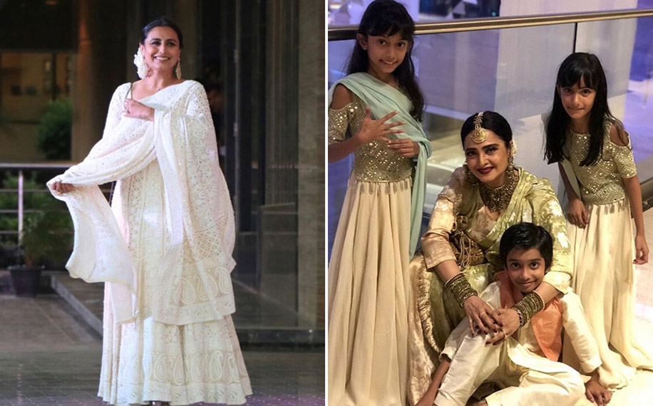 Rani Mukherjee wore an all white long kurta and sharara while Rekha kept it eternal in a gold and ivory saree. Seen along with Rekha are Farah Khan’s triplets dressed in ivory and mint.