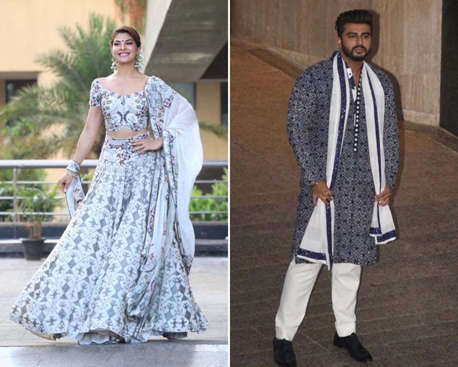 Jacquline Fernandez chose a pearl and powder blue lehenga by Anamika Khanna. Arjun Kapoor stood out in an indigo and white creation by Manish Malhotra.