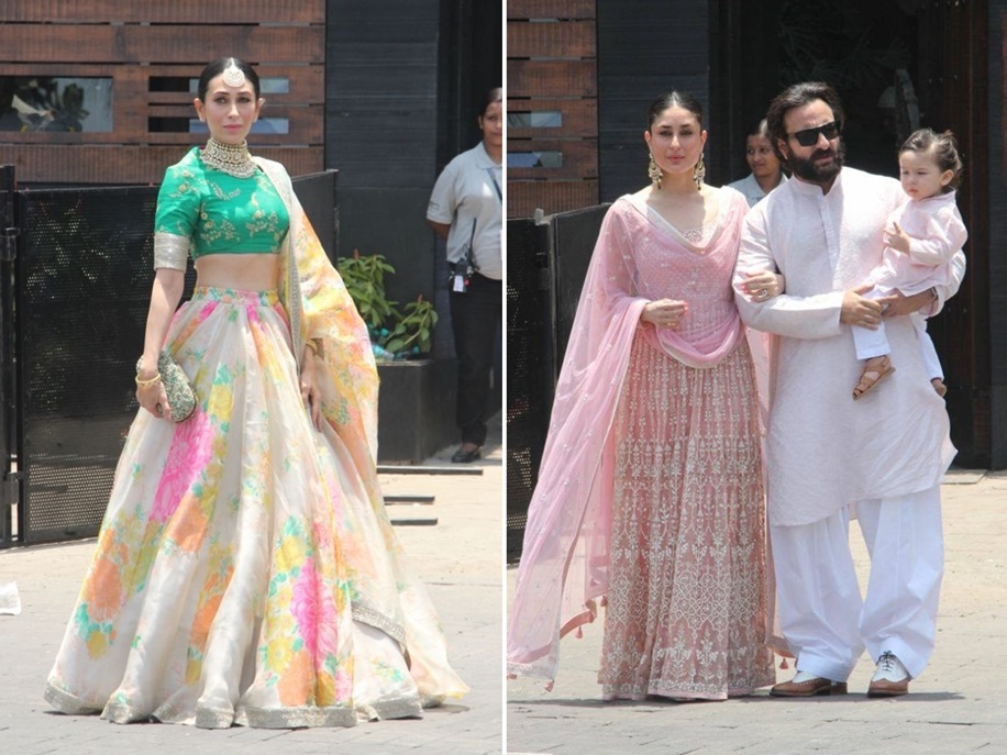 Karisma Kapoor was seen in a bespoke hand-painted organza lehenga with an emerald green hand-embroidered crop top by Sabyasachi. Younger sister Kareena Kapoor wore a baby pink, heavily embellished creation by Anita Dongre.