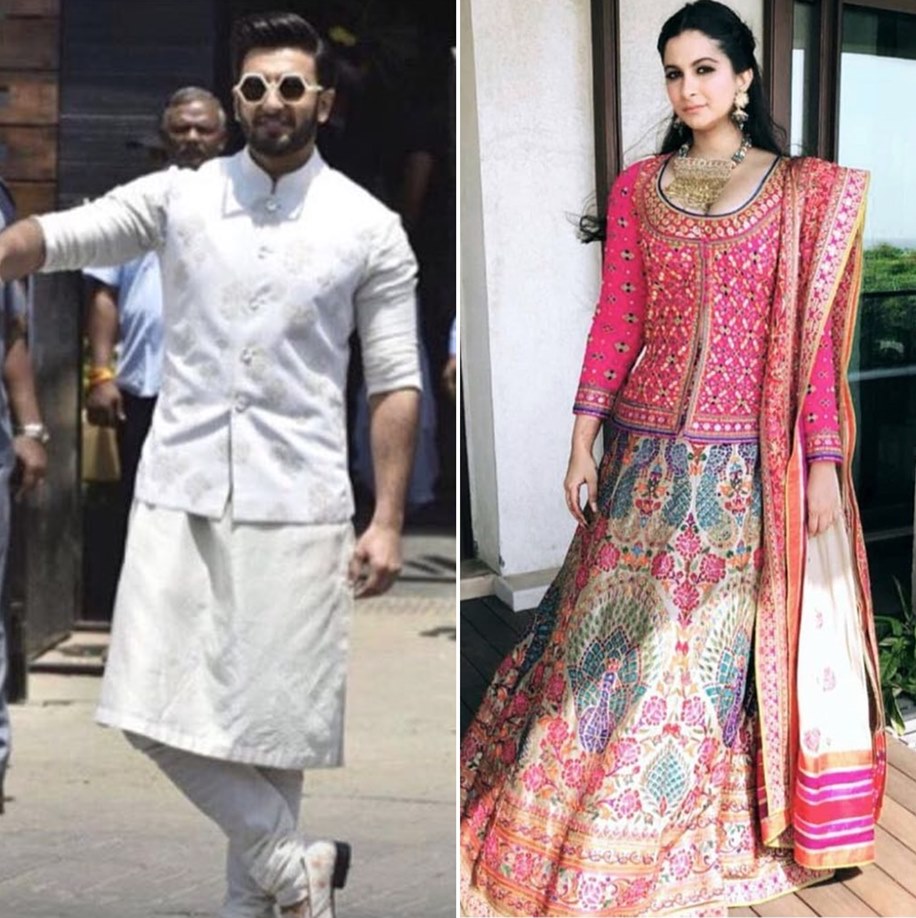 Ranveer Singh looked cool as a cucumber in white kurta an Nehru jacket which he paired with loafers from SVA in the same color. Rhea Kapoor wore a pink lehenga with peacock motifs all over the skirt by Abu Jani Sandeep Khosla.