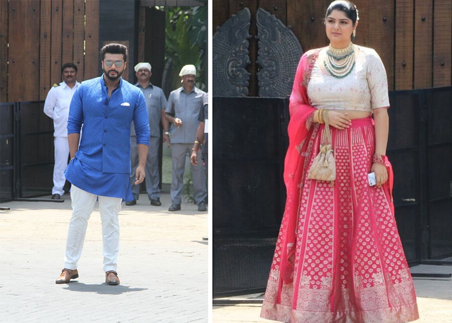Arjun Kapoor went with a classic blue kurta and Nehru jacket by Raghavendra Rathore while sister Anshula Kapoor opted for a bright pink lehenga with golden panel work.
