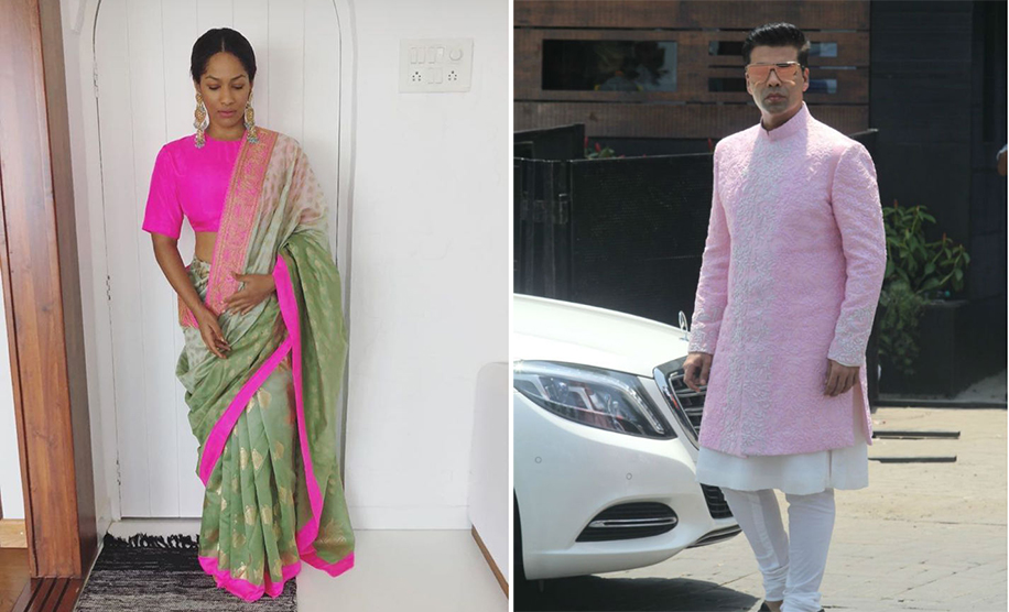 Masaba gave the saree designed by her a contemporary twist by pairing muted green with hot pink. Karan Johar bet the summer heat by wearing a pastel pink and white sherwani by Manish Malhotra.