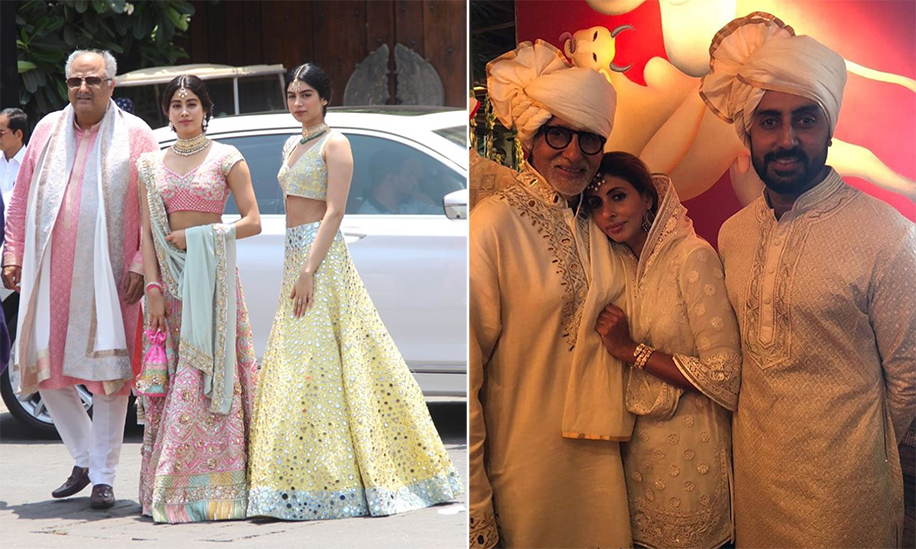 Amitabh Bachchan and Boney Kapoor decided to match their outfits with their children’s. While Amitabh Bachchan, Abhishek Bachchan, and Shweta Nanda were spotted wearing white ensembles by Abu Jani Sandeep Khosla, Boney Kapoor, Janhavi Kapoor, and Khushi Kapoor posed wearing candy-colored Manish Malhotra lehengas.