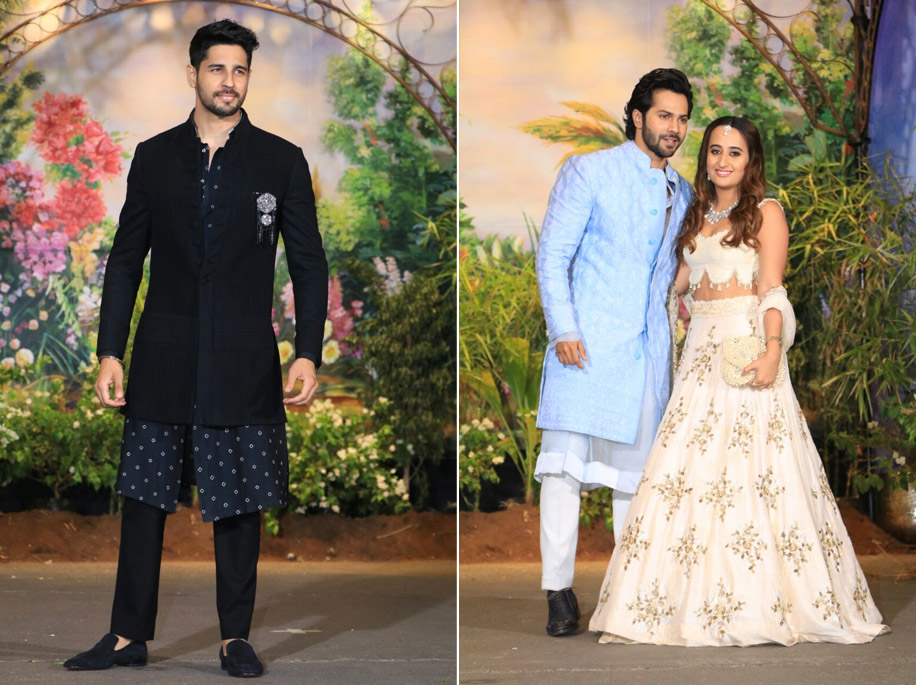 Student of The Year co-stars Siddharth Malhotra and Varun Dhawan seemed to be hooked on to the layered achkan trend. While Siddharth opted for a black outfit by Shantanu & Nikhil with a printed layer peeping out, Varun played with powder blue and white.