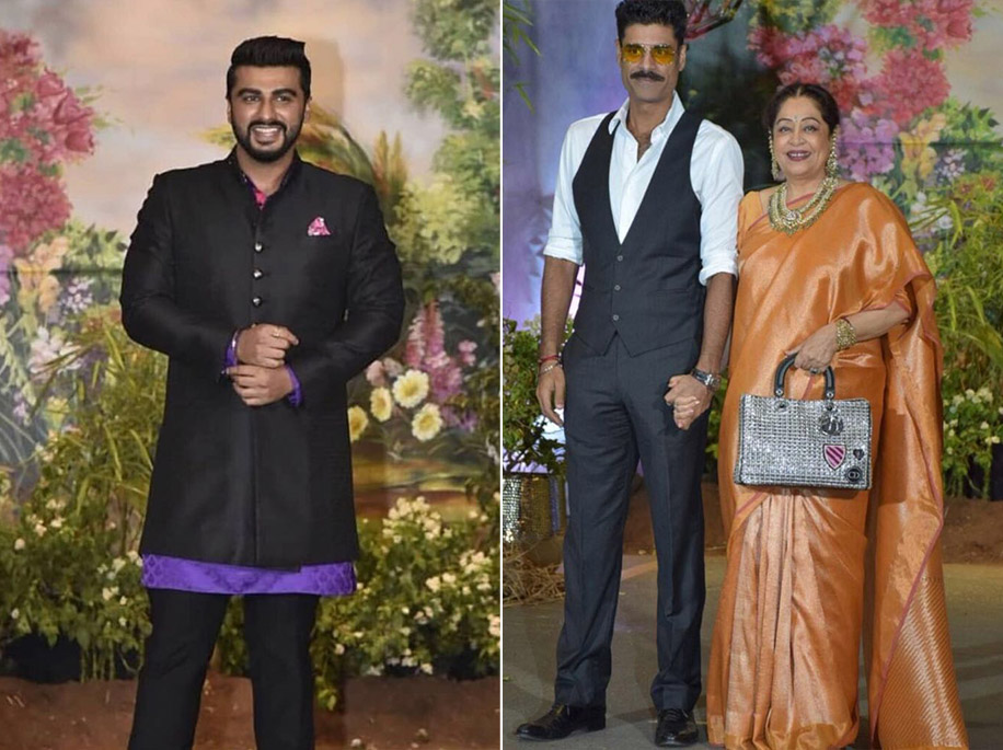 Kirron Kher opted a solid color orange saree while Arjun Kapoor was handsome in a black achkan that he wore over a purple kurta.