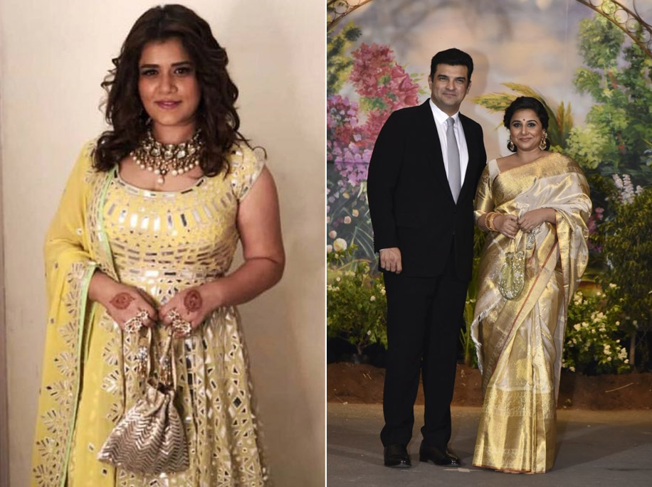 Sonam’s co-star from her latest film Veere Di Wedding, Shikha Talsania, brought with her a cheery vibe by opting for a bright yellow Anarkali by Abu Jani Sandeep Khosla. Vidya Balan wore a timeless kanjevaram saree in white and gold.