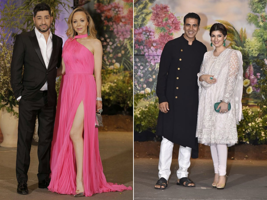 Tamara Ralph and Micheal Russo, graced Soman wedding, immaculately dressed in a black tuxedo and pink gown respectively. Akshay Kumar opted for a black bandhgala with buttons on the side while Twinkle Khanna opted for an intricately embroidered white chuddidar suit by Abu Jani Sandeep Khosla that she paired with lustrous emeralds.