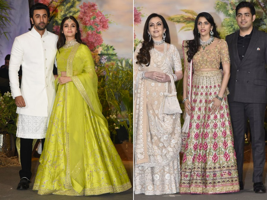 Alia Bhatt made her appearance in a lime green lehenga at the after party and Ranbir Kapoor stunned in a white outfit by Manish Malhotra. The newest member in the Ambani household, Shloka Mehta, opted for a creation by designer duo Abu Jani Sandeep Khosla.