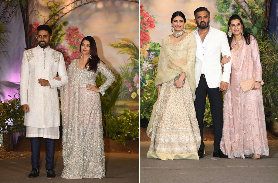 Aishwarya Rai Bachchan went with an outstanding anarkali that was covered in delicate handwork while Abhishek Bachchan sported a white achkan. Both their outfits were created by Manish Malhotra. Athiya Shetty wore a white and gold lehenga by Rahul Mishra.