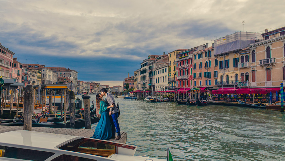 Venice is beautiful—improbably so, neither land nor water but somewhere in between as it lifts from the green of the Adriatic. The city is drenched in so-exquisite-it-hurts beauty, be it the tracery of arches in the Doge’s Palace or the pinpoint of lights from boats in the lagoon at night. It’s the kind of place that’s spectacular in every shade of light, and thus, an ideal destination for your pre-wedding shoot.