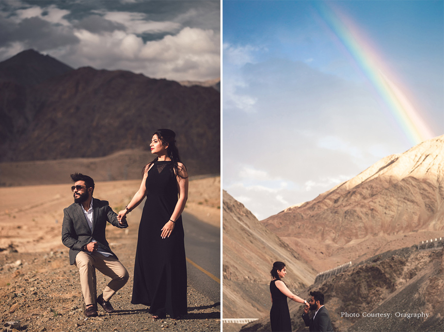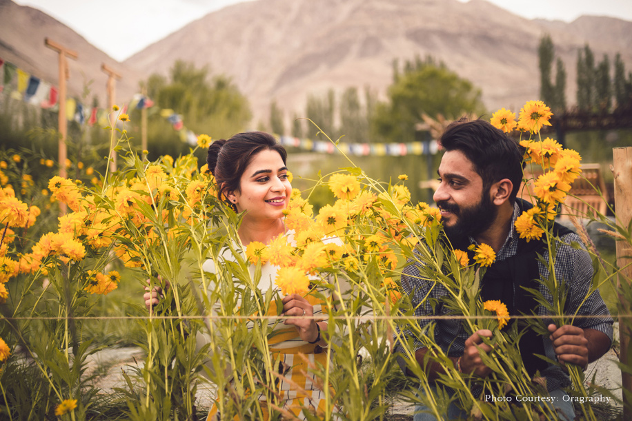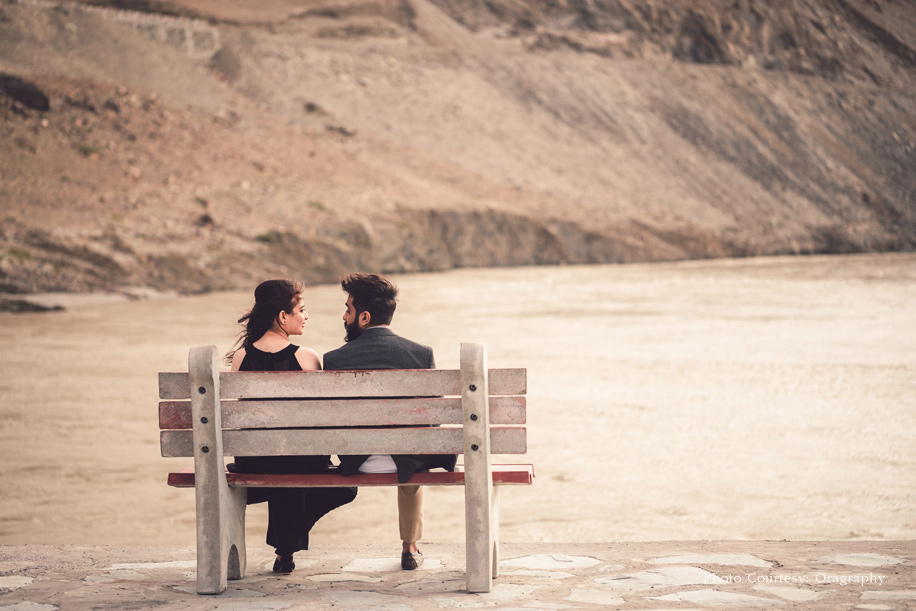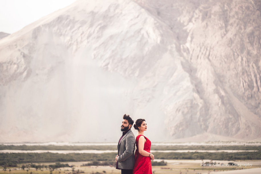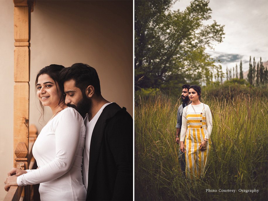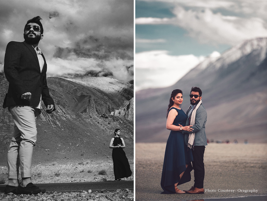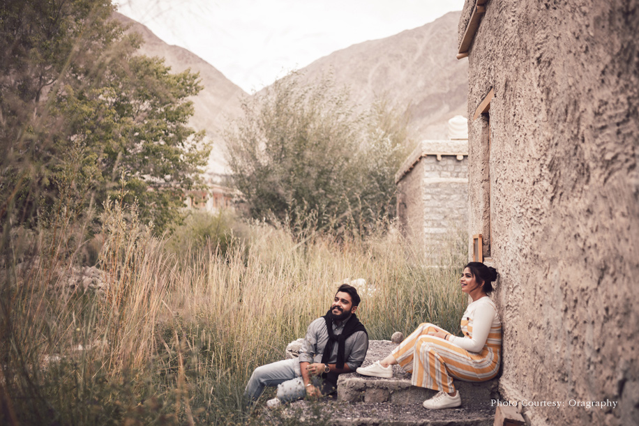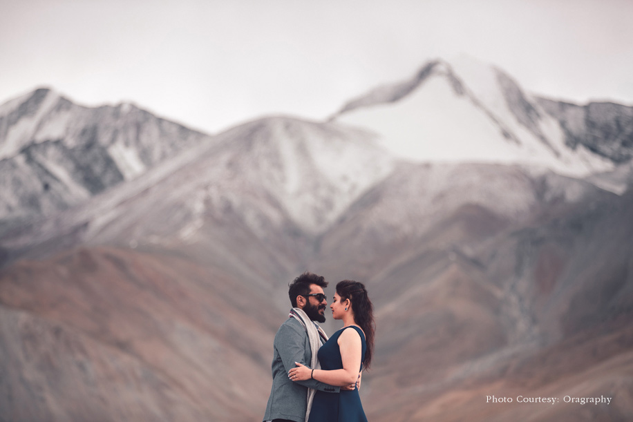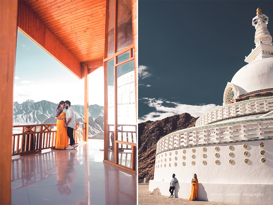 Setting the bar for pre-wedding photoshoots really high, the couple set out to explore the untouched mountains, picture-perfect snowy backdrops, and the exotic monasteries of Ladakh. Here, we share highlights from their epic shoot as team Oragraphy tells us all about it.