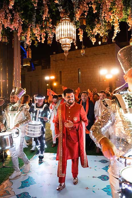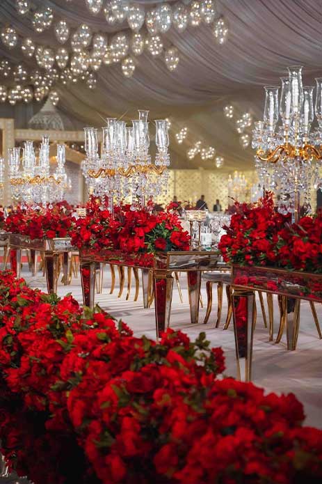 For the big day, all stops were pulled as the team left nothing to chance in their quest for perfection. Rahul shares, “The wedding began with ‘The Royal Mughal Baraat Raat’ which took a cue from Mughal times. The guests were welcomed by over 50 soldiers who were lined up along the driveway as their cars Asateer Tent at Atlantis, the Palm. Hostesses greeted the incoming guests with the traditional ‘salaam’ and everyone was in awe once they walked into the venue. Decked up with hundreds of fresh roses, the decor was inspired by royal Mughal palaces and flaunted a colour palette of gold and red. Handcrafted water fountains were strategically placed on each side and their tinkling sounds added an aura of dreaminess to the venue. Custom-made furniture and designer tableware graced the dinner tables. Elite members of the UAE Royal family, like His Highness Sheikh Nahyan bin Mubarak Al Nahyan were also part of the prestigious guest list. Pakistani actress Sara Loren performed gracefully and the evening progressed into a ring exchange between the couple. Closing the night was star singer Ali Zafar who serenaded everyone with his enchanting tunes.”