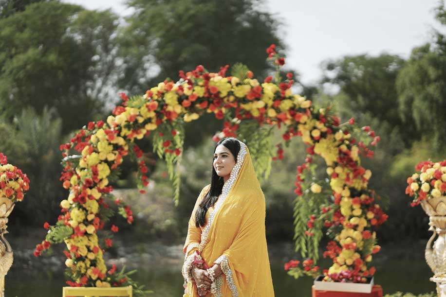 The following day was dedicated to the Manjay ceremony where the bride and groom are slathered with turmeric. After this ceremony, the couple doesn’t step out of their respective houses. For Sania, this ceremony was hosted at her home with a ‘Sheesh Mahal’ theme. Sania entered under a floral chaadar into the garden while her close relatives bestowed her with gifts and showered her with flower petals. Equipped with a rickshaw photo booth and a clay bangle-making counter, the guests had an engaging time at the event as they enjoyed a lavish breakfast spread.”