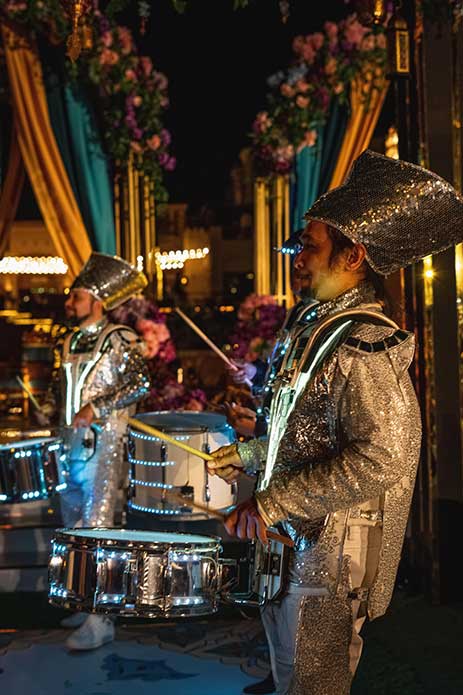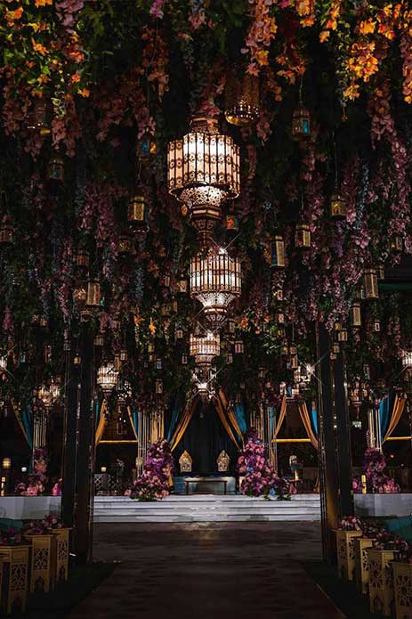 After the home-based ceremonies, it was time to step up the glamor for which the couple moved to a glamorous venue to celebrate their mehndi and sangeet bash. Taking a cue from 1001 Arabian Nights and Agrabah Bazaar, the venue was decorated with an ‘Aladdin’ theme. Walkways adorned with Moroccan lamps adorned the entrance while a souk area filled with knick-knacks piqued their curiosity. Hostesses dressed in white gowns bestowed them with pouches filled with coins that could be used to purchase baubles from the souk carts that contained handmade accessories, diaries, pens, jewellery boxes, etc. A violinist also played enthralling tunes while a Turkish Ice Cream cart captured the kids’ attention!”