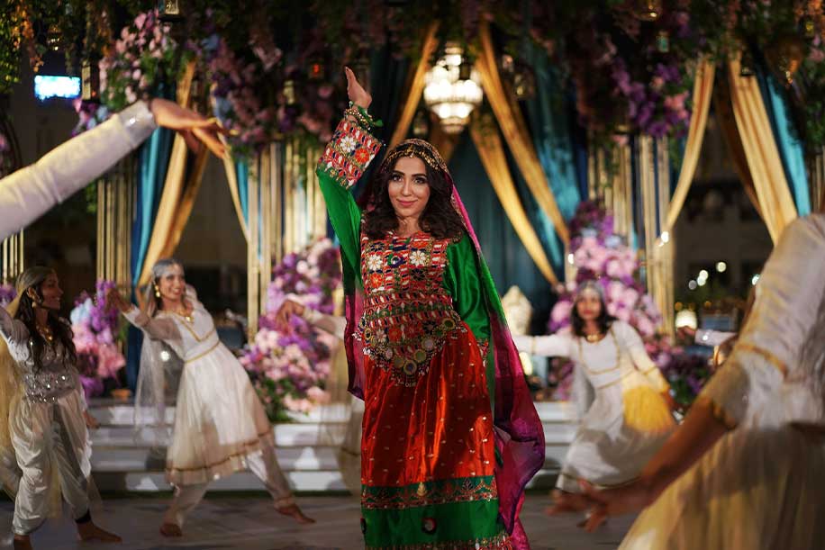 To elevate the experience, we also had a gorgeous violinist at a height playing her beautiful tunes. On the other side, our famous Turkish Ice Cream cart had kids giggling to his tricks and parents enjoying this picture-perfect sight while having their ice cream. It definitely looked like the Agrabah Bazaar straight out of Aladdin. On the decor front, the furnishings were upholstered in vibrant hues while the dinner tables were decorated with Moroccan centerpieces. Celebrity emcees Gauhar Khan and Yasir Hussain entertained the guests and kickstarted the sangeet and mehndi rituals. The groom’s sisters carried gold thalis filled with mehndi after which Bilal entered accompanied by an LED Drum Band, SFX, and his groomsmen. Sania meanwhile entered on an abra (a royal boat) with twelve boats behind her equipped with dancers in costumes. After the couple had made their entries, Pakistani celebrities Ayeza Khan and Danish Taimoori also arrived to wish the to-be-weds.