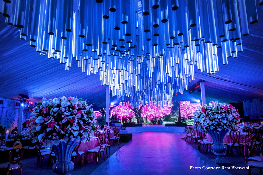 The celebrations began with the couple’s sangeet where sparkling chandeliers illuminated the banquet and ambient lights drenched the venue in a pink glow. Complete with large golden elephant structures, velvet drapes, bright cushions and Moroccan lamps, the setup exuded a regal appeal. One of the highlights of the event was the creatively conceptualized entry of the bride who appeared sitting on an ornate golden throne. The other prominent feature was the grand LED stage that had been set up for all the performances by the Bollywood celebrities present there. Round tables with beautiful overlays and centerpieces of large floral arrangements in exquisite vases dotted the venue and welcomed the guests to a night of entertainment.