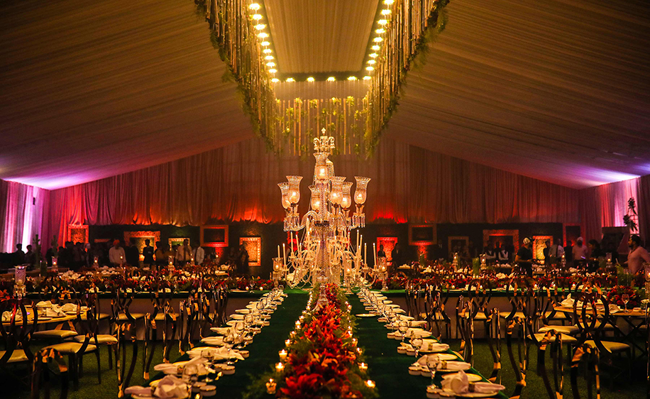 The nikah carried a distinctive North Indian appeal with aesthesis inspired from the palaces of Rajasthan. The imposing stage comprised of five dome-shaped pavilions, often seen in structures that are fine examples of Indian architecture, supported by intricately carved pillars. While the backdrop for the central canopy was smothered in red roses, those for the remaining four displayed stunning relief work. With jaali panels adorning the front of the stage and impressive chandeliers and flickering candles in tall candelabra lighting up the structure, the setup left the guests in awe.