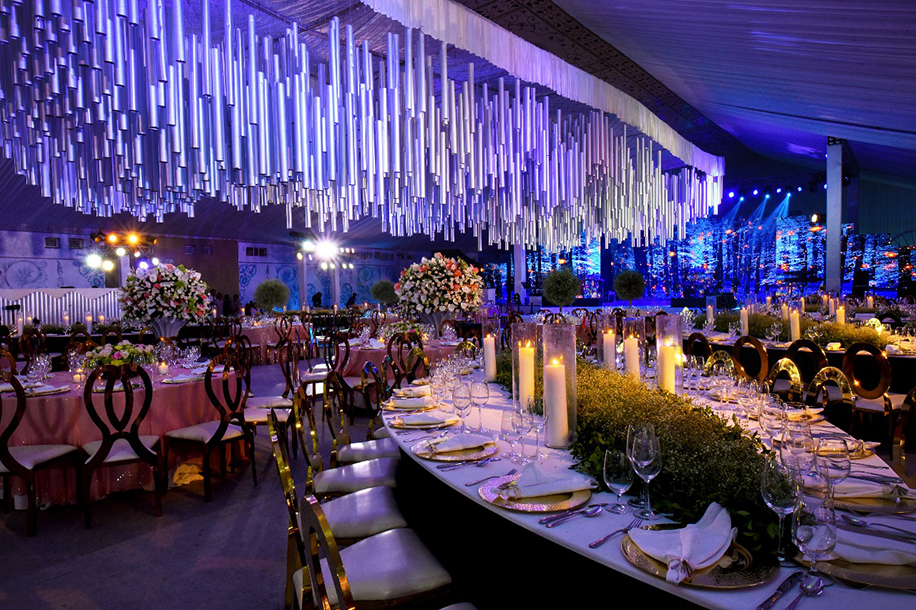 After two functions that followed more traditional themes, it was time to shake things up a little for the reception or the Valima. For this function, the décor took a more contemporary approach. A long pathway was created leading to the stage that was backed by a panel that 3D mapped visuals of cherry blossoms. The path was flanked by large floor vases that were full of exotic posies. A colossal structure of hanging pipes was suspended above this walkway to add yet another element of interest to the gorgeous setup. The dining area too was elegantly done. White flowers sat gracefully on the tables while minimalistic golden chairs surrounded them. The blue light that lit up the venues not only heightened the mood of the event, but also helped in creating a relaxed, yet memorable atmosphere.