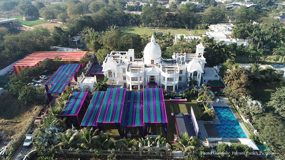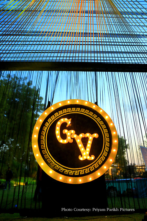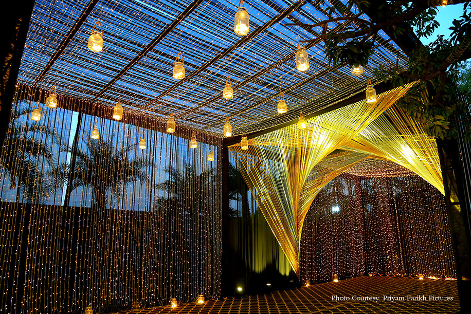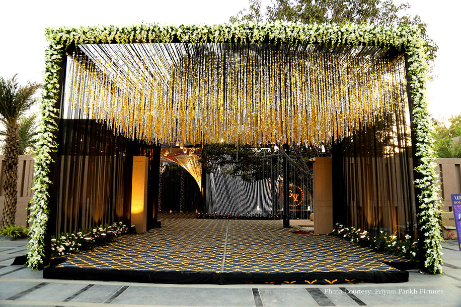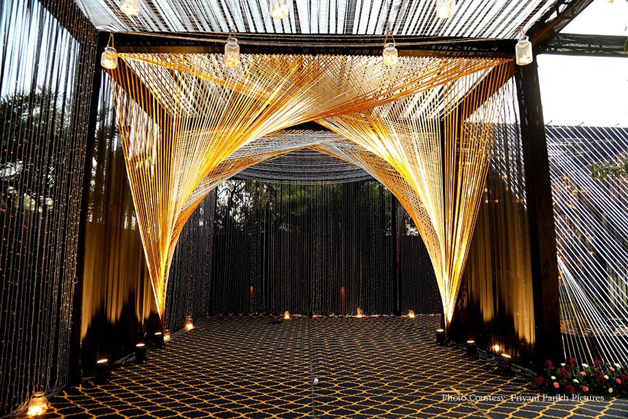 The following day saw the sangeet being hosted in style. This function was all about contemporary elegance and incorporated a black, gold and white color scheme. String art decor forming geometrical patterns decorated the vast spaces and created a striking visual impact. “The idea was to give this event a unique look. We wanted it to be glamorous and modern at the same time, so we created life-size installations with ribbons and lit the spaces with lots of fairy lights. We also brought in yellow power cans which were placed strategically to create interesting contrasts with shadows,” says Keyur. The event was made even more spectacular thanks to a riveting performance by singer Neha Kakkar.