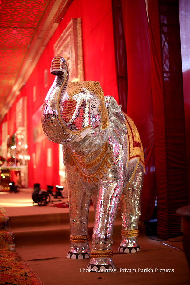 Regal Indian aesthetics made for a classic wedding setup, and for the wedding ceremony, Prasang Events used red and gold elements to transform the grounds and create a palace-like setting. A large elephant structure covered in mirrors, chandeliers, and fragrant flowers set the stage for a memorable event. Sharing the inspiration behind the setup, Keyur shares, “The couple’s wedding was a traditional affair, and the mandap was the highlight at the event. A large golden structure, it was decorated with sevanti blooms, roses, gulchadis along with rajnigandhas, and around this, we created an amphitheater-style seating that could easily accommodate up to 600 people. The rituals commenced with a Ganga Aarti with 21 pandits chanting the mantras which added a spiritual touch to the celebrations, and as the evening continued, Nayan Pancholi kept everyone entertained with the lagna geet in his beautiful voice.”