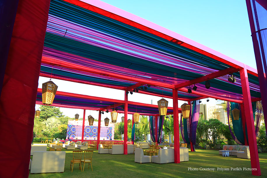 The mehndi was inspired by the exotic colors of Morocco. The event was hosted at the bride’s home and combined richly colored drapes with golden lamps and mosaic patterns. Keyur Patel says, “This was the first event, and we wanted to ensure that it set the right tone. The highlight here was the WishTree, where guests could leave their messages for the couple.”