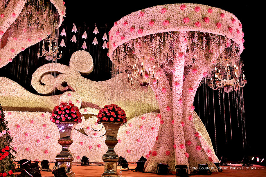 The grand and elegant reception was resplendent with flowers and foliage. “Almost every element used as part of the decor, including the stage, was enveloped in different varieties of flowers such as hydrangeas, gypsophilas, orchids, carnations, and roses,” says Keyur Patel. “While the use of flowers added a sense of softness to the occasion, the glow of chandeliers enhanced the romantic vibe.