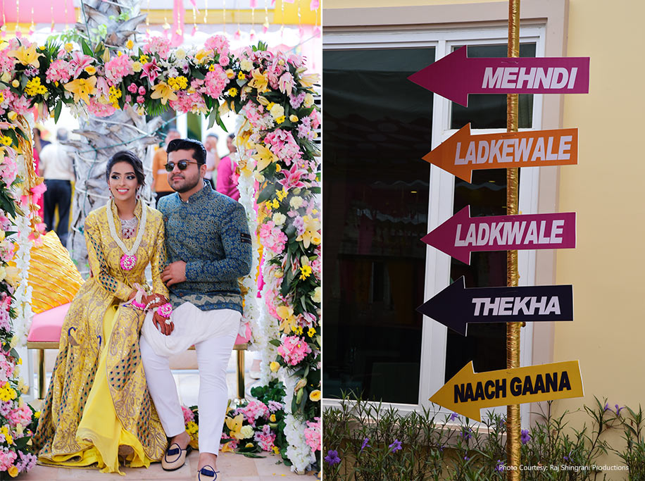 The mehndi celebrations were hosted on the expansive green lawns of the hotel saw decor full of yellow and pink-hued color theme. The ceremony was designed to be a fun outdoor celebration with pretty decor elements and fresh florals accents. With several canopies with pink, orange and yellow drapes built for the guests’ right by the pool, the décor theme perfectly complemented the gleaming surrounding.