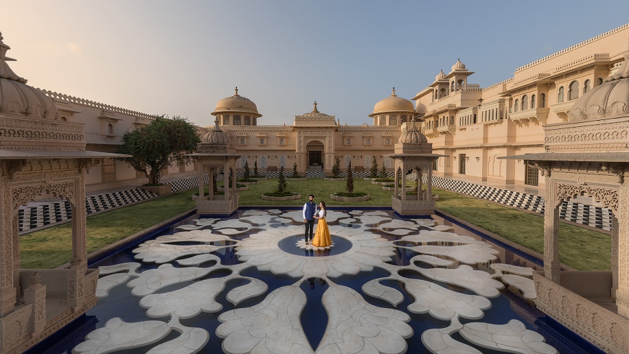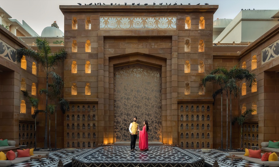 “We had organized a trip to India to go wedding shopping and decided to do a pre-wedding photo shoot at the same time. We’re both huge fans of everything Rajasthani and thought Udaipur was the perfect place. A friend did the shoot for us. We were in Udaipur during peak summer so we would wake super early to start shooting before sunrise to capture our images in the best light. We were blessed to have access to the most amazing hotels we’d ever seen. We shot in The Leela Palace and The Oberoi Udaivilas. We also captured shots in the streets wearing full traditional attire.”