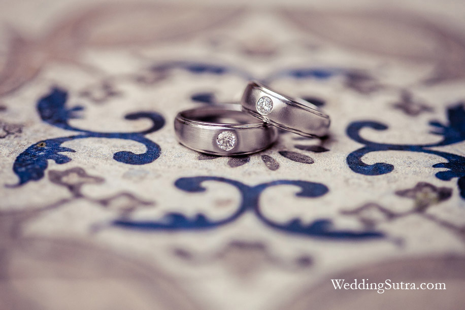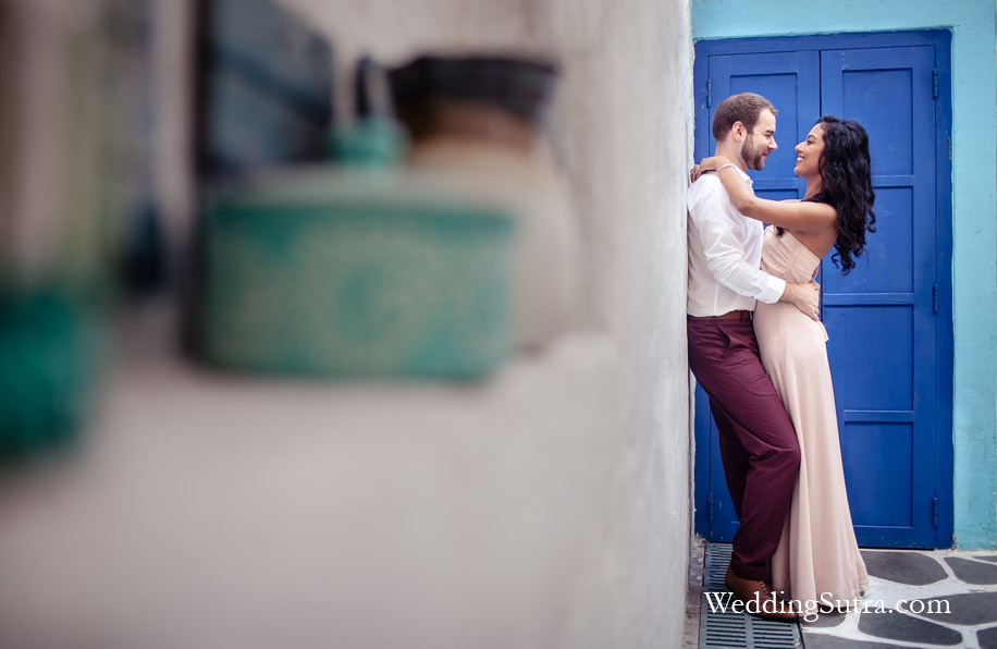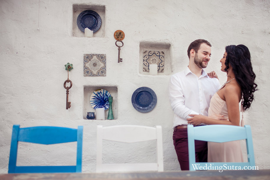 The Grecian-inspired Thalassa, in Bandra, Mumbai – with its blue and white walls and taverna feel – was the perfect backdrop for the couple to let their hair down and soak in the golden sun. “We loved the artistic vibe at Thalassa,” Tom enthuses, “Also I’m terrible with photos, so I was pretty awkward at the start but the photographer, Payal Kumar was really helpful in getting me to relax and feel less conscious. Everything from the outfits from Camessi to the jewellery was perfect. Makeup Artist Taniyaa Khanna created magic with her luminous makeup. And the platinum bands from Orra really made us feel special. We thought they were a perfect symbol of our relationship. In all, I was happy to do a beautiful pre-wedding shoot with Sudipti and cannot thank the team enough for such a brilliant opportunity.”