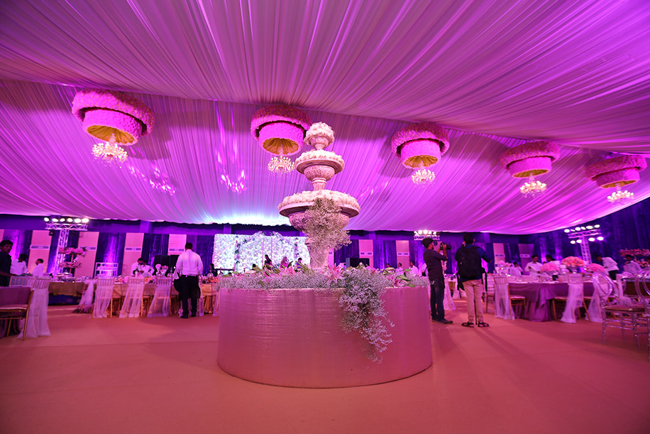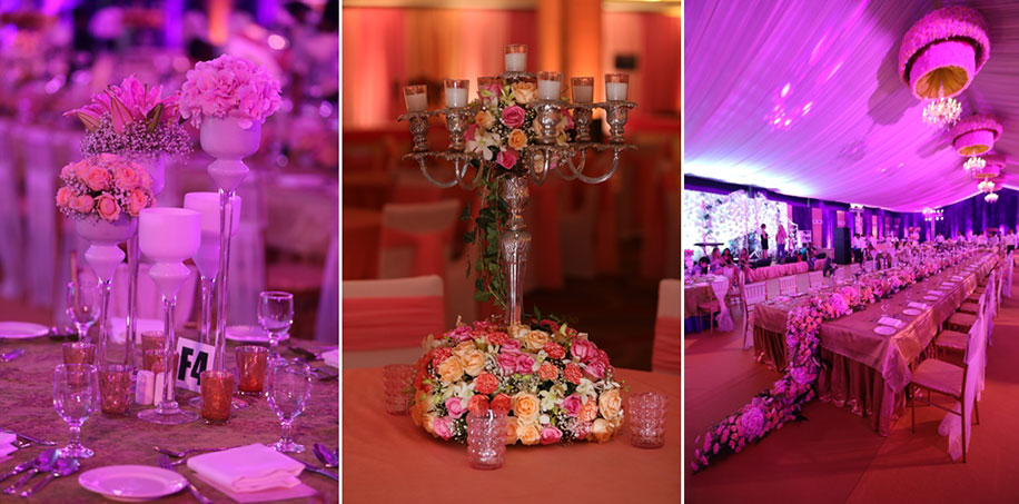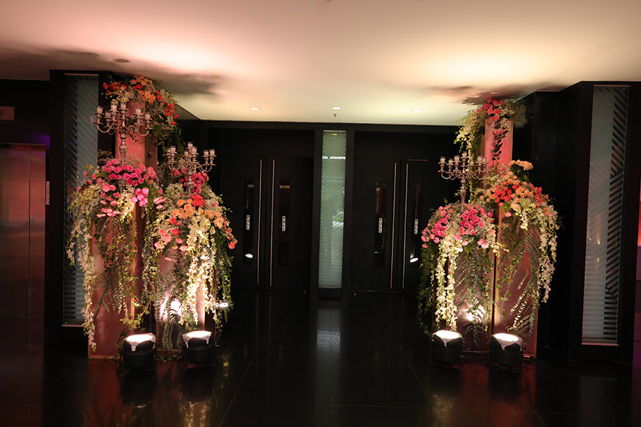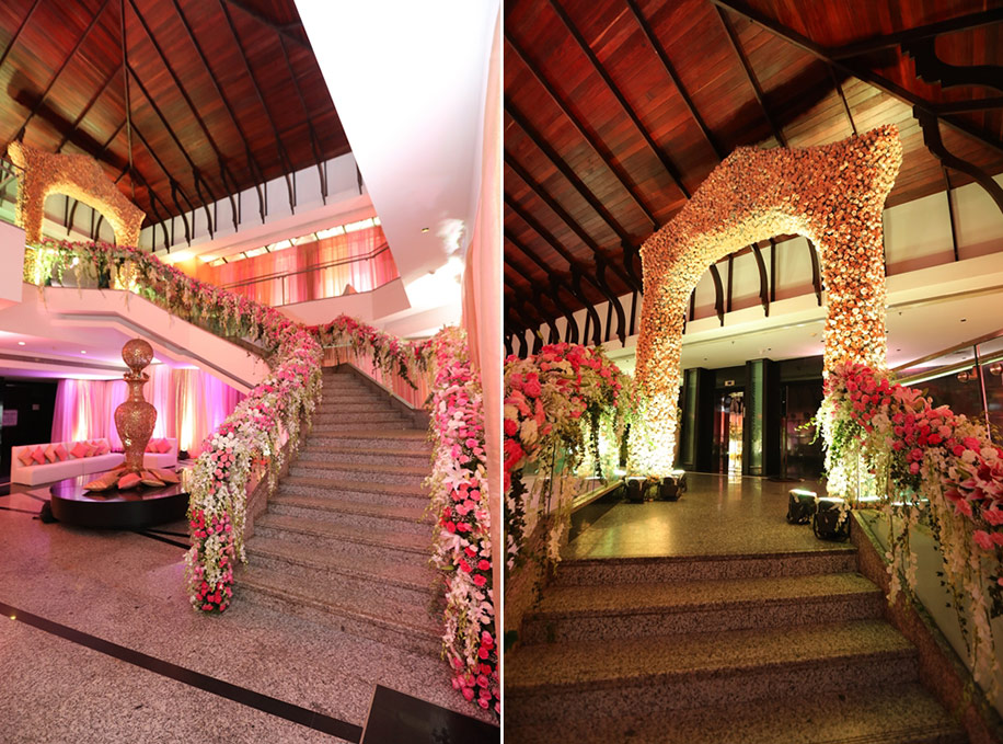 The guests were welcomed into the hotel through a pergola completely smothered with florets in shades of pink and white. The lamps on either side of the entrance and cages in the center further added to the allure of the themed decor.