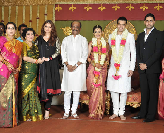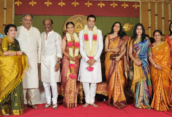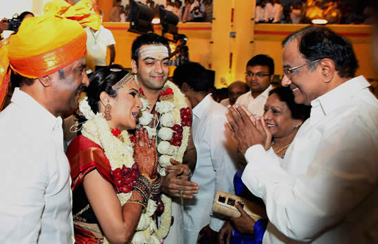 Superstar Rajinikanth’s daughter Soundarya married Stanford graduate and entrepreneur Ashwin Kumar at Rani Meyammai Hall in Chennai last weekend. The bigwigs from the film industry, business world and politics attended the high profile ceremony . For the various wedding rituals, the pretty bride wore various Kanjeevaram saris in gorgeous shades while a pink Sabyasachi saree was her choice for reception.
