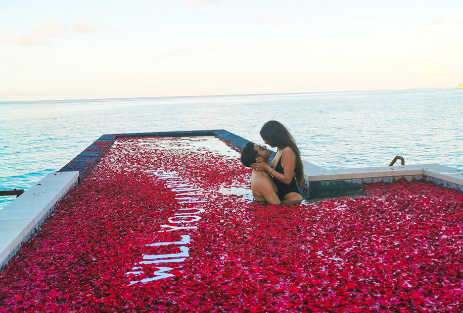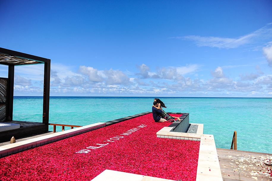 “Once we arrived in the Maldives, it started raining. At one point Neil even considered scrapping his grand plan since chances of pulling off the outdoor setup he had closed on seemed bleak. However, the skies cleared up on the day he had decided to pop the question. That morning he said that we were going to go out to take pictures since we hadn’t got a chance to do so earlier because of the rain and told me to put on something nice. After I got dressed, he led me to a buggy which confused me as he had told me we would be going on a boat. I did ask him what was going on but he dismissed my question. We stopped outside another room, and by this time I really began to wonder what was happening. Everything became clear when he took me to the private pool that was covered in red petals, and white letters were arranged to state, “Will you marry me?”