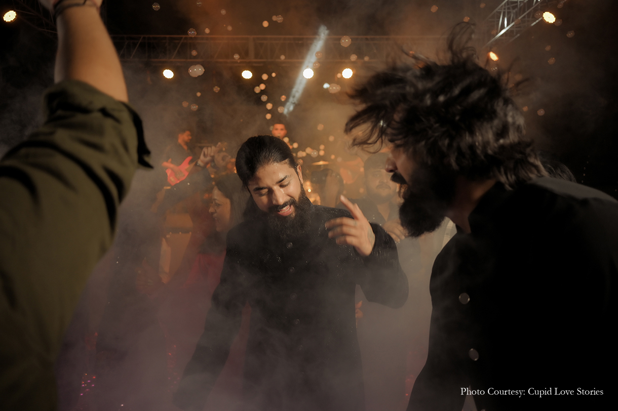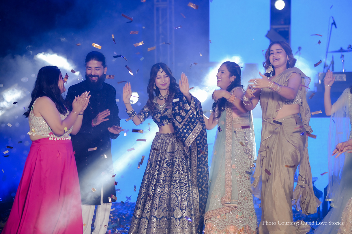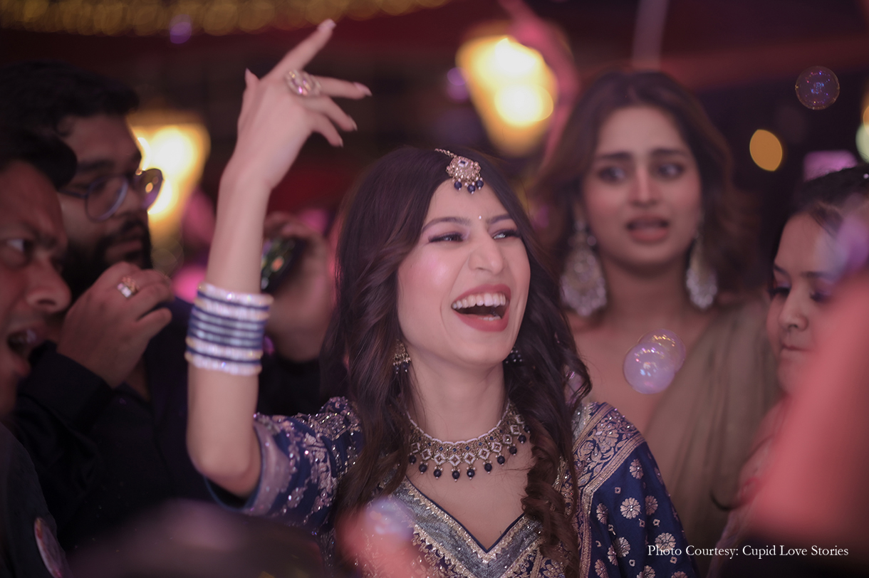 The sangeet, however, was where the energy truly soared. With lights, music, and a stage brimming with energy, the evening unfolded like a high-octane concert. Cheers echoed as performances by loved ones amped up the crowd, and Ritika’s surprise solo dance for Anurag added a deeply personal, emotional high. “That was a moment I’ll never forget,” he reminisced, “I completely lost myself in her.” Ritika dazzled in a navy blue lehenga while Anurag brought charm in a sleek black Indo-Western ensemble — a look that balanced celebration with elegance.
