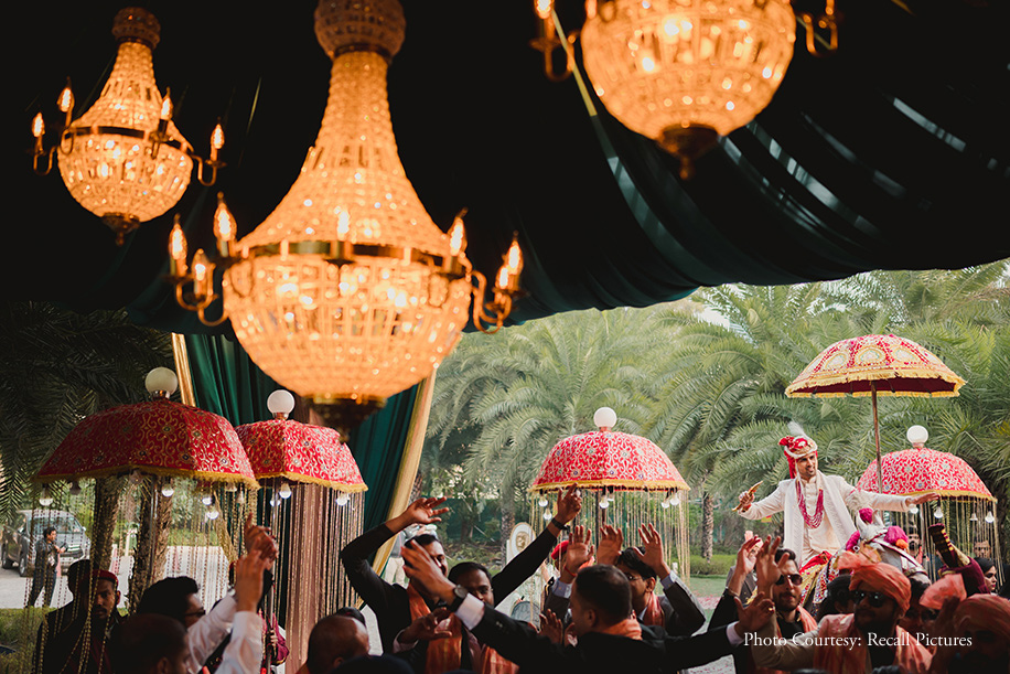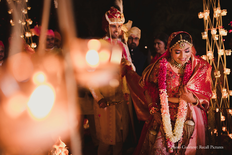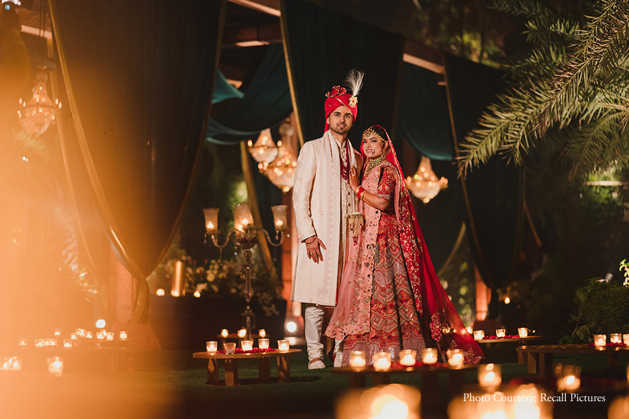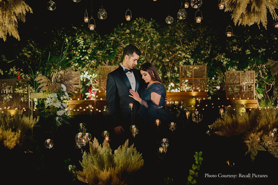 Hosted at Amaara Farms, the Sangeet night was glitzy and high on drama. Shweta shares, “For the Sangeet, the duo was keen on bold colors, and hence chose cirque concept tenting and lighting. A gorgeous walkway was organized for the couple with fireworks and handcrafted light buntings along with a kitschy Ambassador seating photo op for everyone to shoot quirky pictures. Also, instead of the regular stage, we gave them a two-layered circular dance floor where there were plenty of epic performances and emotional speeches exuberantly orchestrated by their family and friends. The decor was replete with pampas grass, infinite candles, and bold maroon drapes that contrasted beautifully against the lush green setting of the venue.”