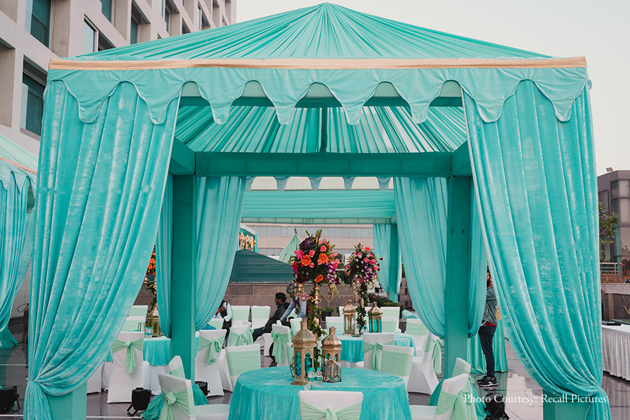 Sharing the creative process behind the Mehendi, Shweta shares, “The Mehendi exuded energetic vibes with aqua blue drapes and linen, while multicolored blooms added a vibrant pop of color to the Moroccan setting. Following the Mehendi was a sundowner party which was hosted on the picturesque terrace of the Le Meridien where everyone enjoyed endless cocktails and coffee while tapping their toes to live acoustic music.”