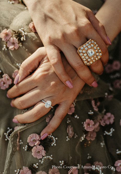 Gagan shares, “Our Roka ceremony was a small one wherein only close family members were in attendance due to the COVID-19 pandemic. Hence, I had my mindset on a photoshoot with Jasdeep after the ceremony. Soon, I found Amanda on Instagram, and after connecting with her, the search for the perfect location commenced. Knowing that Jasdeep is an outdoorsy person, Amanda started scouting parks that were close to my residence, and after visiting a couple of spots, both of us zeroed in on the perfect one! We both kept the color of my outfit in mind while choosing the location since I was really keen on making the olive and pink hues pop in the photographs.”