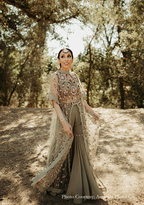 Rambling on the vast plains of wild grass, the duo unleashed their playful and stylish sides while flaunting their best profiles. Describing her favorite moments from the photoshoot, Gagan says, “One cannot be stylish without being comfortable. Jasdeep and I slipped on our comfy shoes to navigate through the rough terrain, and once the camera started clicking we switched to our fancy footwear. I think for me, the best shot is the monochrome picture in which Jasdeep is running behind me. The aesthetics of that picture really stands out as my gharara and cape flow behind me giving it a fairytale-like aura. Working with Amanda was a fun-filled experience where we collaborated effortlessly to make our vision come true.”