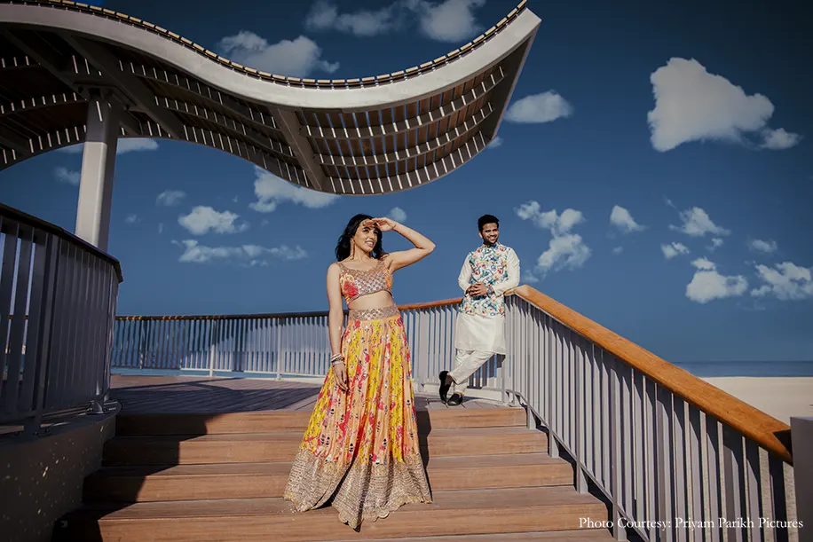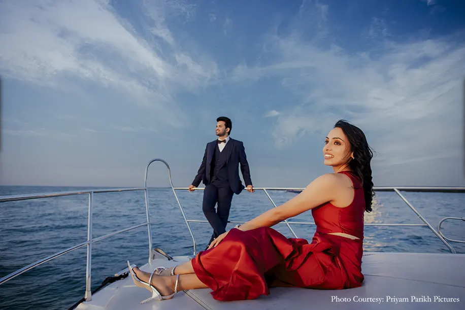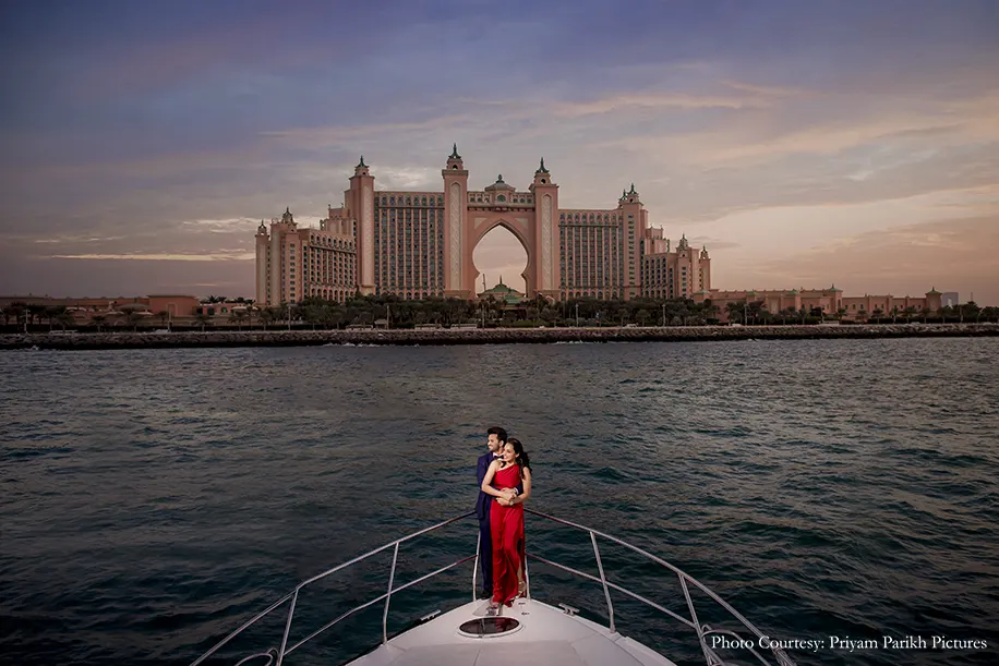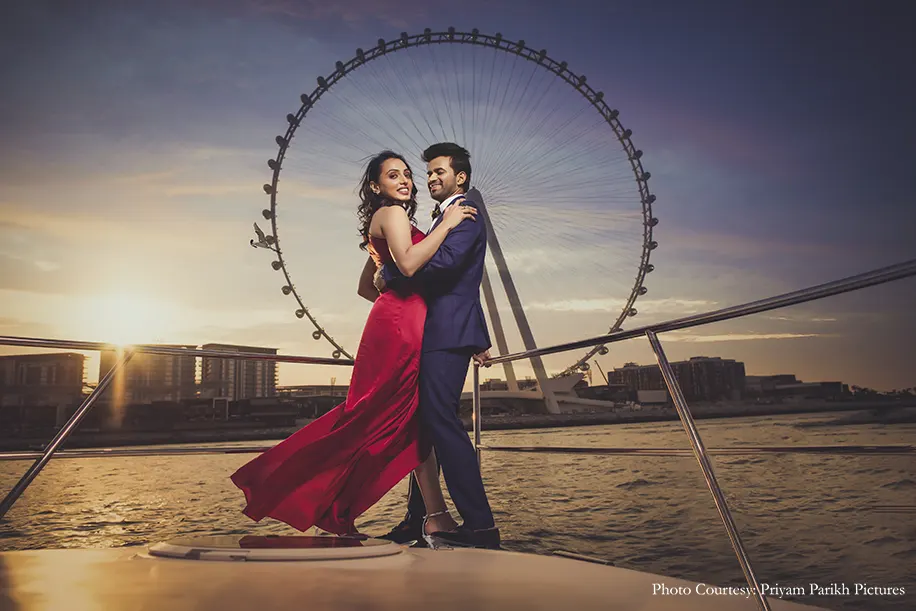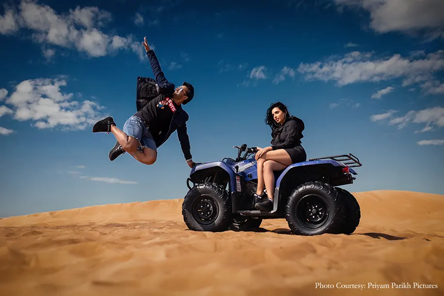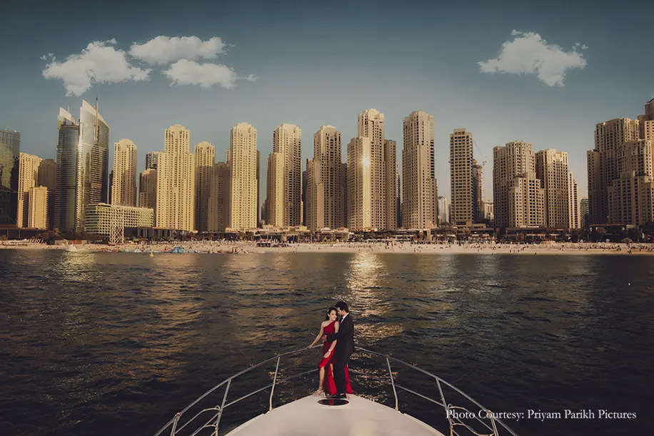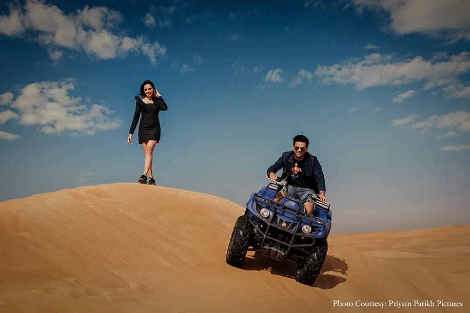 Helmed by Priyam Parikh Pictures, the shoot was an absolute success as each shot conveyed the love the duo felt for each other. Zalak shares, “At first, we had absolutely no idea about the theme of the shoot but with Priyam Parikh Pictures’ help we brainstormed and came up with a theme that mimicked a glamorous couple’s journey in Dubai. From lounging on a yacht, basking under the desert sun, riding ATV bikes, jet skis and cars, to coming back to the luxurious hotel, each part of the shoot was thrilling! The fun part for me however, was choosing and changing into the outfits at the crack of dawn. But, all things considered, it was a rewarding experience where team Priyam Parikh Pictures gave us something incredibly unique photos for both of us to cherish for the rest of our lives. Be it love or an arranged marriage, I think everyone should consider executing a pre-wedding shoot as it definitely made our bond stronger!”