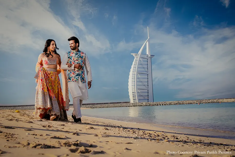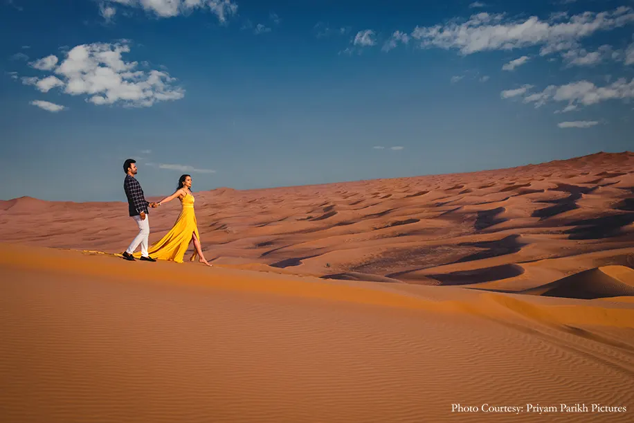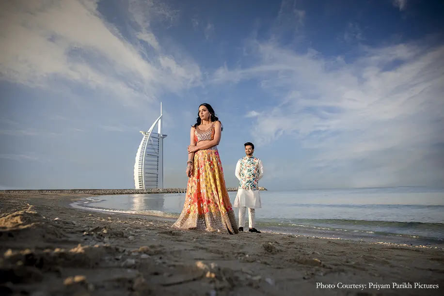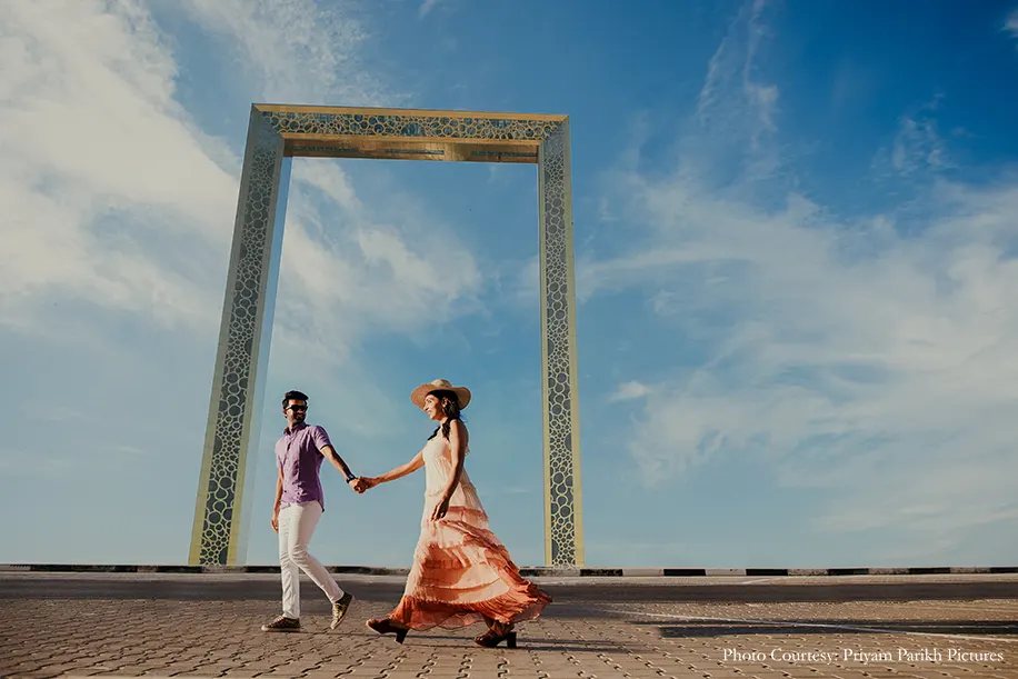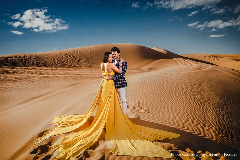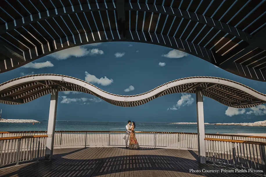 A traditional arranged marriage setup led Dr. Zalak Patel, a practicing doctor, and Harsh Patel, a real estate entrepreneur to cross paths. Despite having lived in the same neighborhood, the duo had never met but once they saw each other’s profiles, cupid was quick to strike. However, as the pandemic made its way around the globe, the duo had to grapple with a postponed date. But they quickly adapted to the uncertain times and found their silver lining. They decided to execute a pre-wedding shoot to capture their precious moments before they became life partners. To help encapsulate these memories, they chose WeddingSutra Favorite – Priyam Parikh Pictures who with their unbridled creativity clicked stunning pictures of the couple against the stunning Dubai landscape.