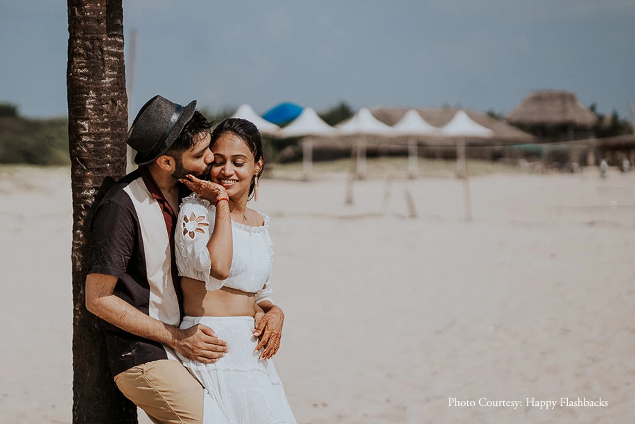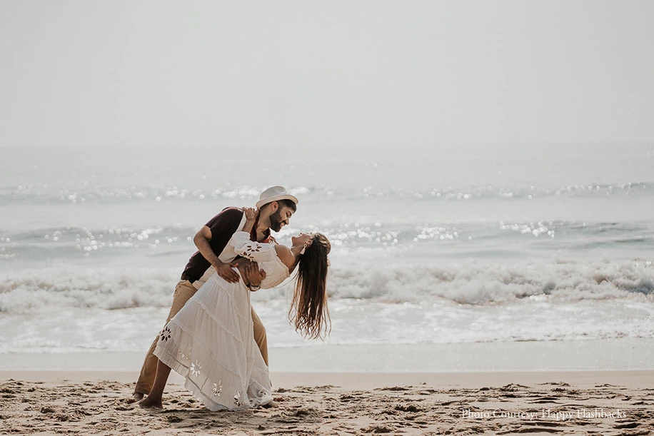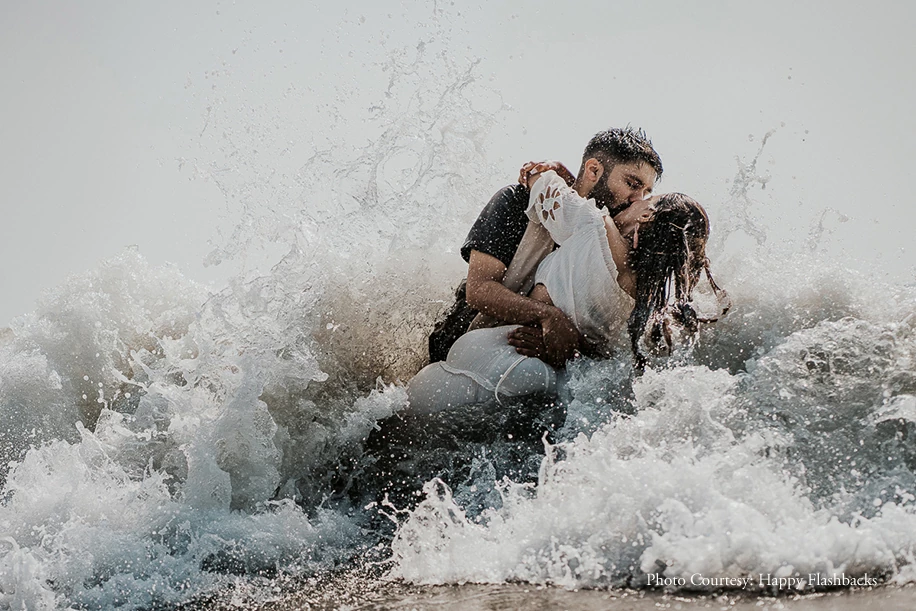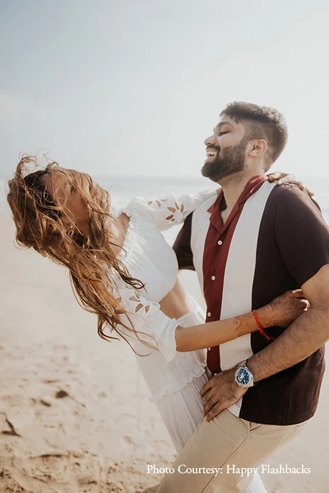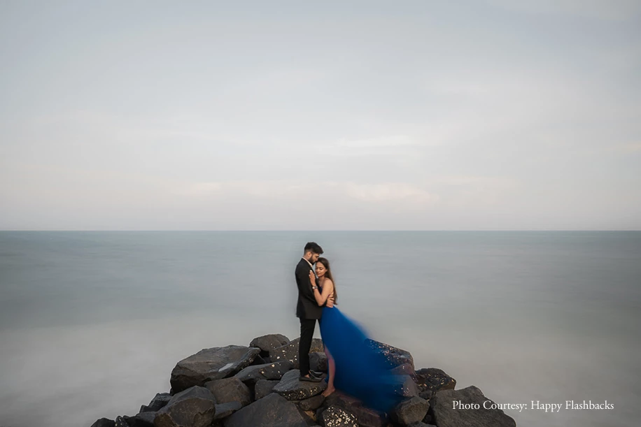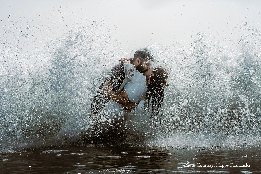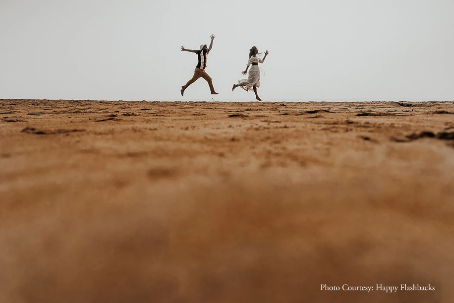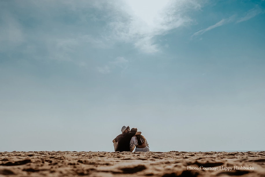 As the pandemic raged on around the world, orchestrating a pre-wedding photoshoot was no mean feat. But teaming up with the couple, Happy Flashbacks understood their vision and accomplished this colossal task effortlessly. Describing the planning that went on behind the scenes and the unforgettable moments of the shoot, Ayushi says, “Due to COVID-19, we couldn’t travel to the destination we originally had in mind, so we zeroed in on the closest beautiful place in the same city which was Pondicherry. At first, I was really hesitant but after some research, I realized that the destination did not matter as long as Aayush was there with me. For the theme, we decided to go with ‘beachy vibes’ since we were on a coastal location.