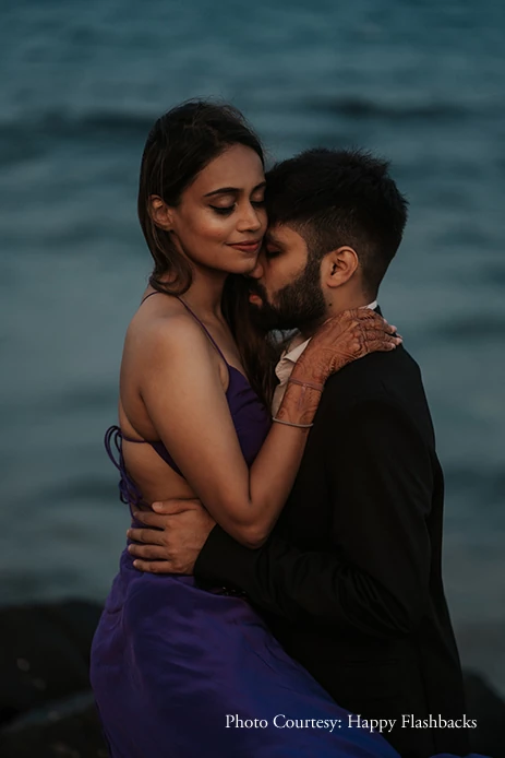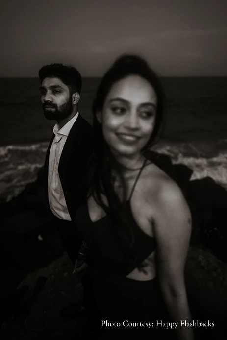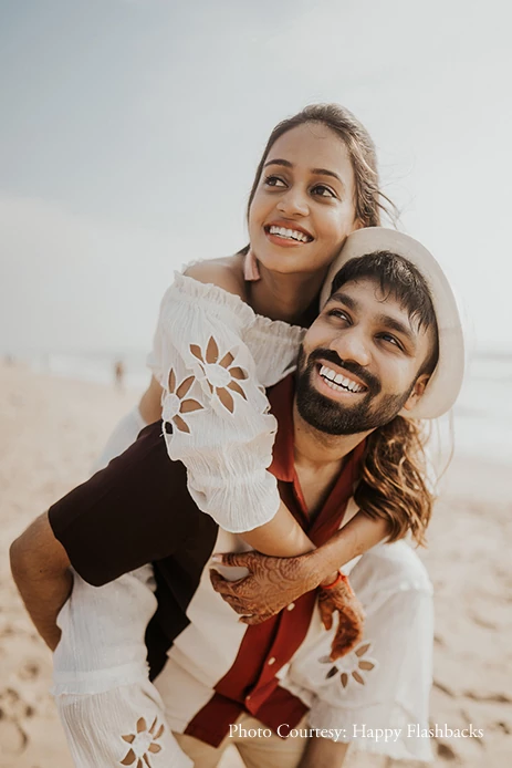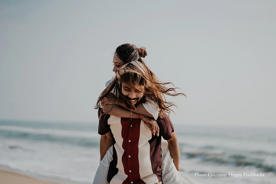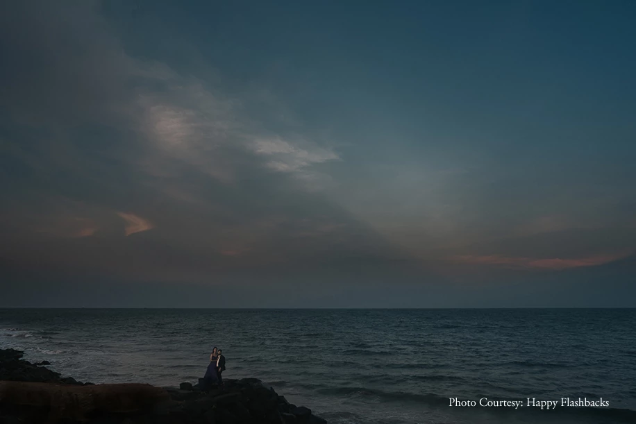 Gushing about her experience with the photography team, she goes on to share, “Our experience with Happy Flashbacks was nothing short of seamless. Quite by chance, we stumbled upon them online while we were shortlisting our wedding photographer. Our initial planning started off as we discussed our pre-wedding shoot locations, where they suggested many off-beat venues. But due to the pandemic, we ended up choosing Pondicherry that was closer to home. Both of us knew from day one itself that they were the perfect choice as photographers, as their team was very warm, welcoming, and understood our vision clearly. Pre-wedding photoshoots are challenging at times, but they never made us feel uncomfortable. In fact, they encouraged us to be ourselves in front of the camera and to enjoy the scenery around us. After looking at the pictures we were completely blown away by the quality of their work. From understanding us as a couple and our journey, to capturing candid glimpses of our nervousness on our big day, working with Happy Flashbacks has been a wholesome, hassle-free, and heartwarming experience!”
