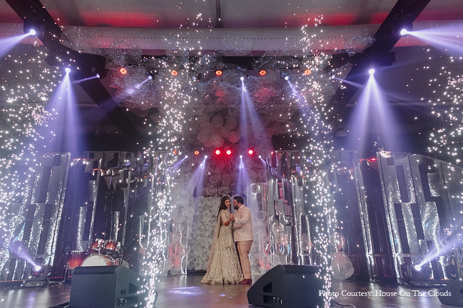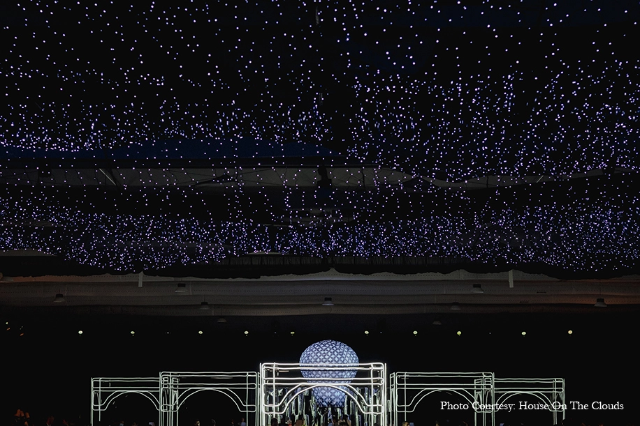 An Indian wedding is never complete without a Bollywood-inspired Sangeet event! To ensure that everyone shook a leg to their favorite tracks, Kanika and Pavan along with the planning team orchestrated a glitzy Sangeet night that blew everyone’s mind! Furnished with a colossal stage that was swathed in metallic silver and black hues, the stage was larger-than-life with its grandeur. Adding drama to the setup were small twinkling lights that resembled a starlit sky.