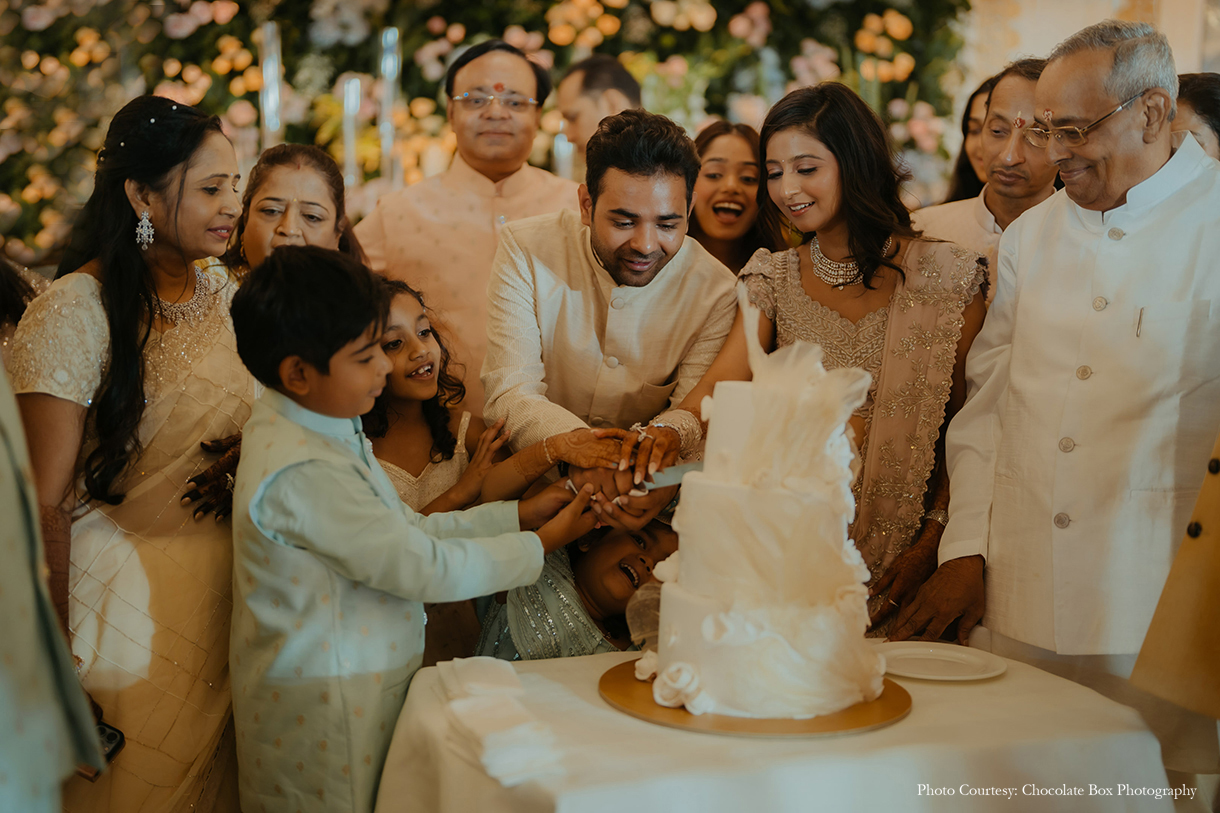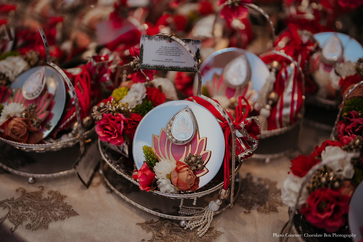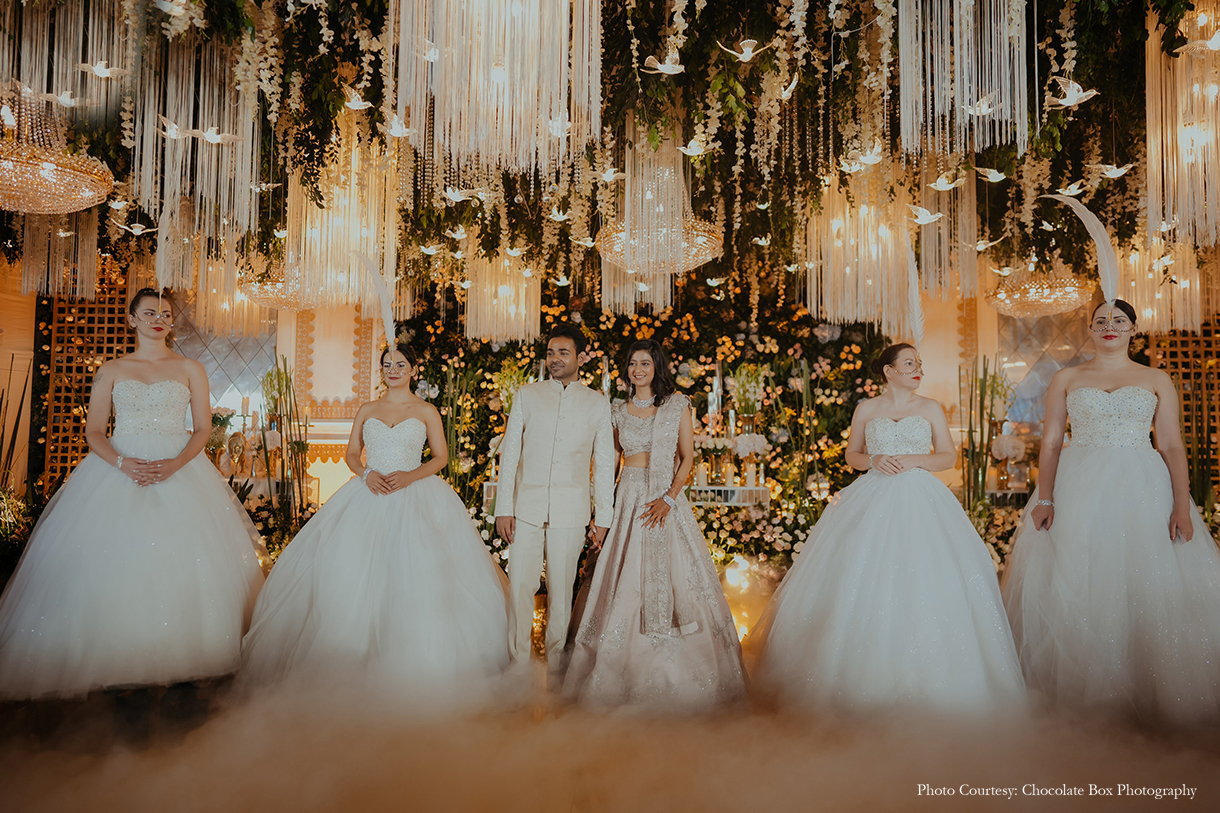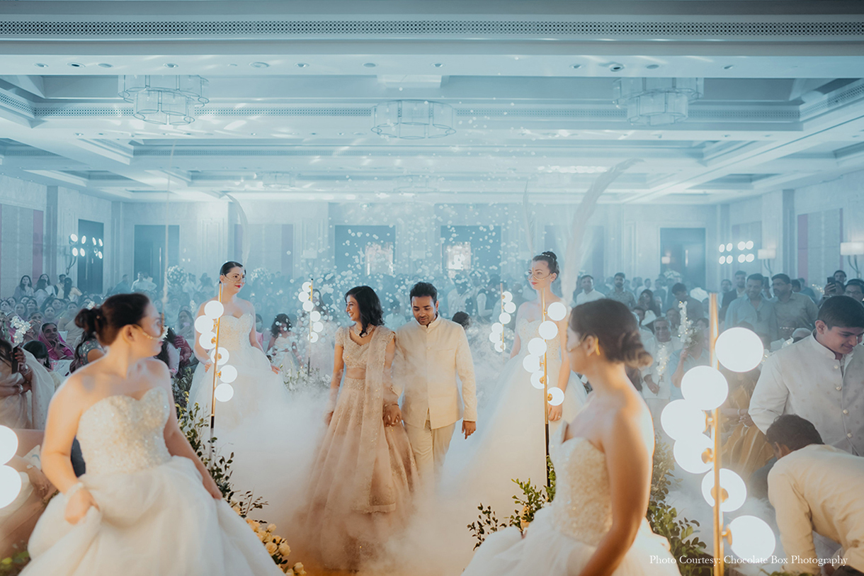 The couple made a stunning entrance accompanied by dancers while guests swayed floral sticks with lights creating a picture-perfect moment. Additionally, the guests also received exquisitely arranged German silver trays complete with personalized cards, which were a highlight of the evening. On the logistical front, we accommodate nearly 100 travelling guests and were involved in coordinating pick-ups and check-ins to ensure a hassle-free experience.”