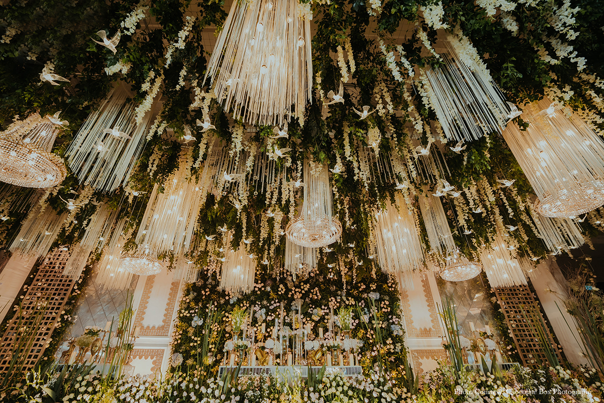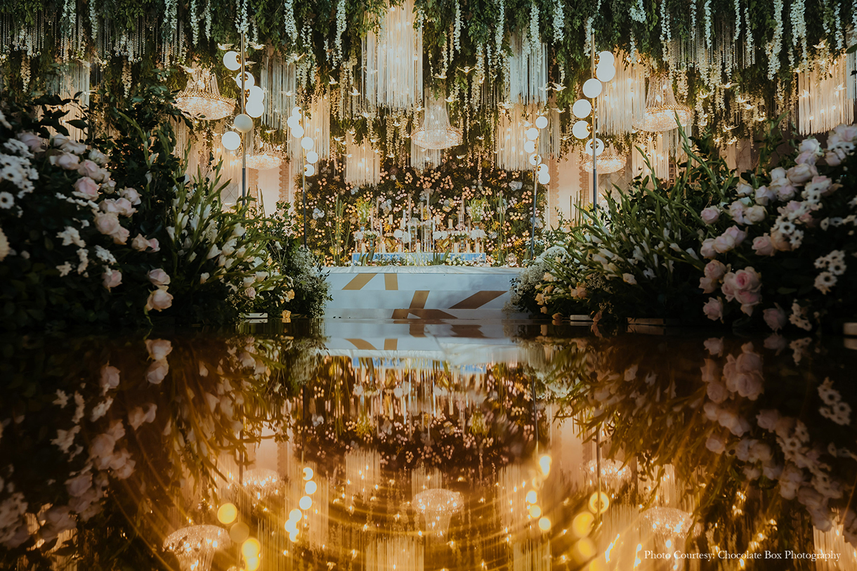The brief from the couple emphasised an immersive experience for the guests and elegance as Akansh Jain and Himanshu Kotari from Weddingz by Mindz share, “ ‘Dreamy’ and ‘Upscale’ were two keywords used by the couple as they gave us the brief for the event. They wanted the design to be sophisticated and elegant, incorporating timeless elements. However, we just had a night for the complete turnaround, Thankfully, the squad worked hard and used their creativity to transform the venue into an enchanting landscape with floral and chrome elements.