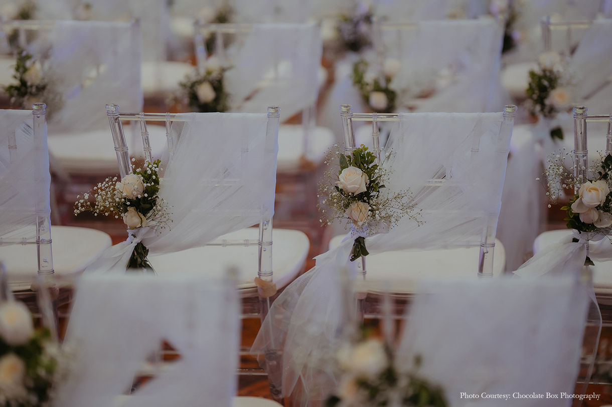 Uddipta Banerjee from The Escapade gives us an overview of the decor, “We crafted a grand stage, an aisle fringed by bloom, and adorned chairs with elegant bows and flowers. Crystal chandeliers threw their warm light on the yellow blooms to create a cosy yet opulent atmosphere.”