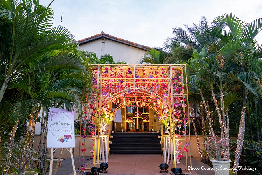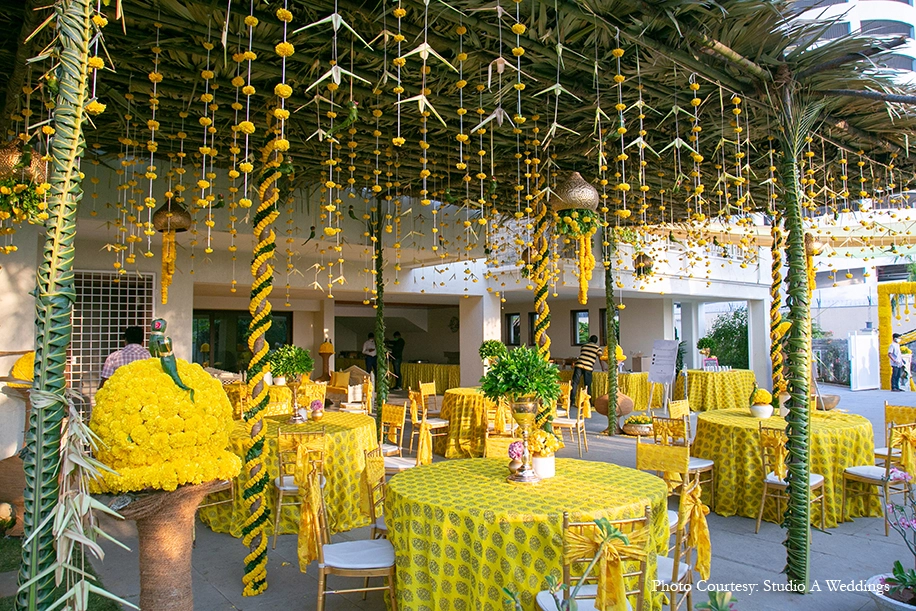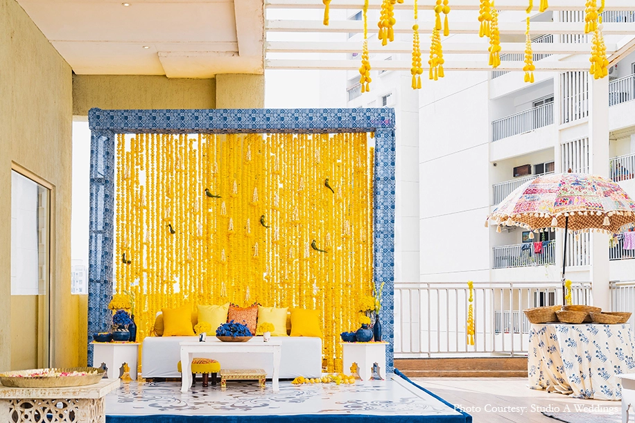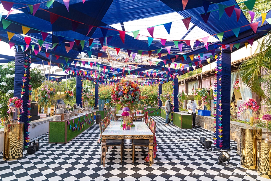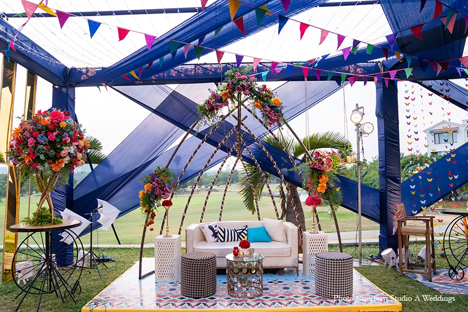 Kaleidoscopic decor crafted with intricate details, whimsical accents and arresting color stories set the tone for the vibrant Mehndi celebration at Boulder Hills Golf Course. Royal blue columns made up the boundary structure, hung with flowing drapes and a canopy of colorful flags. Vivid hues of flowers found their way onto every corner of the function culminating in the awe-inspiring stage backdrop. A quirky mix of prints in furnishings and props added to the lively ambience which was highlighted with numerous photo-ops, fairy lights, origami butterflies, hearts and more.
