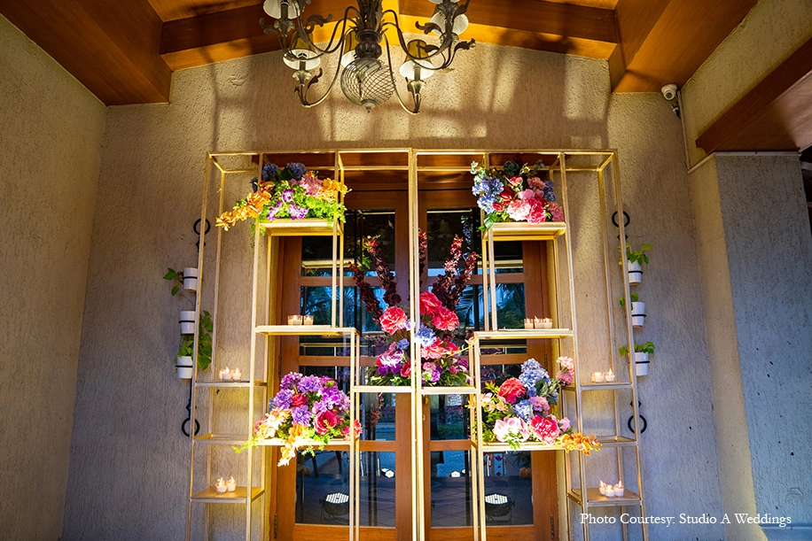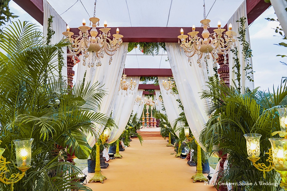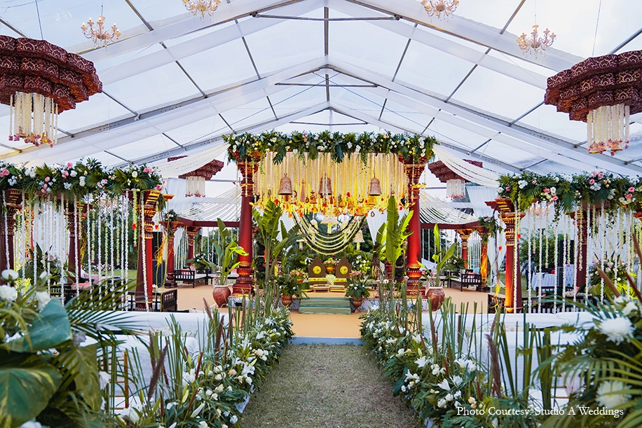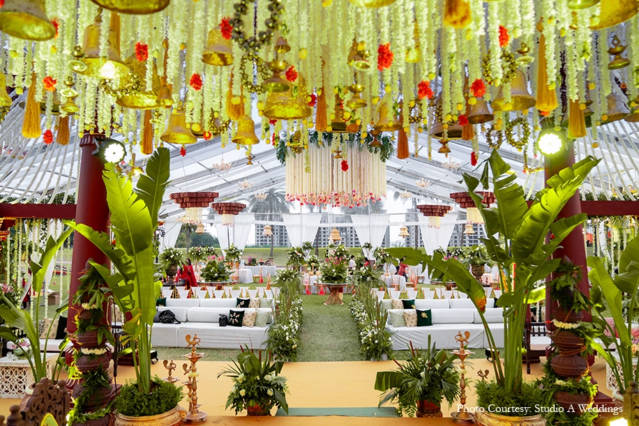Hosted at the Boulder Hills Golf Course, the wedding was a grand, yet serene affair intimately crafted with spectacular decor. The groom entered with great panache on a golf cart. Neutral tones of ivory set a tranquil ambience elevated with a striking blend of traditional accents and tropical greenery. Brass vases, lamp stands, animals, bells and other props including earthy columns with traditional motifs, banana leaves, peacock installations, strings of mogras and roses celebrated the essence of India, while plush arrangements of white drapes and exotic greens with flowers gave the occasion a contemporary luxe feel. A mix of antique and floral chandeliers made for an interesting visual experience, as did the exotic aisle leading to the stunning mandap bedecked with a canopy of bells and flowers.