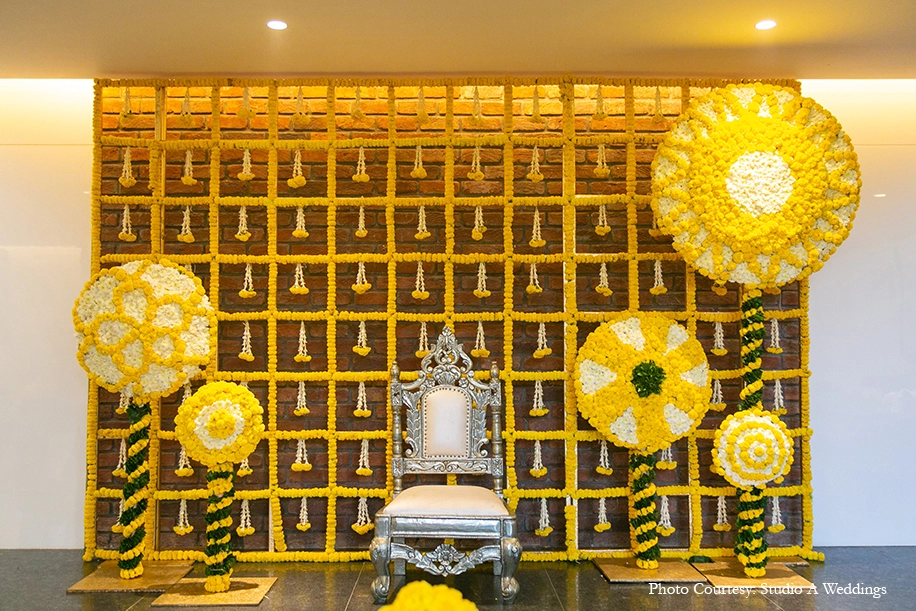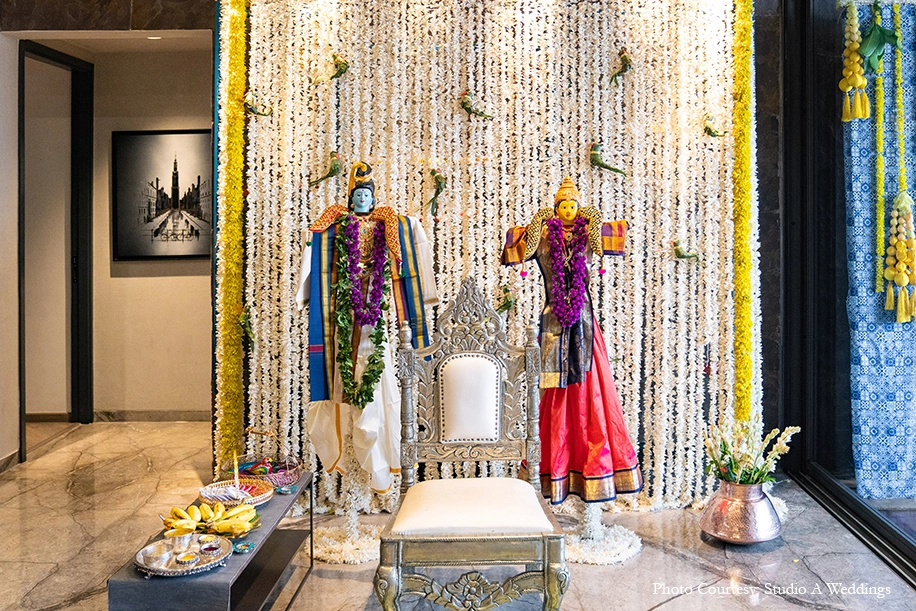 The Pellikuthuru and Pellikoduku ceremonies for the bride and groom respectively were intimate soirees set in refreshing hues of yellow and blue. Marigolds ruled the decor in several forms, from flower vase arrangements to canopies, installations and backdrops. Earthen pots and vases added to the traditional feel of the occasion, while brightly colored flowers further added to the yellow paradise. The highlight however was the Radha-Krishna idols that brought in a sense of auspicious tranquility to the ritual. Guests were given saplings and handmade soaps as thoughtful giveaways.