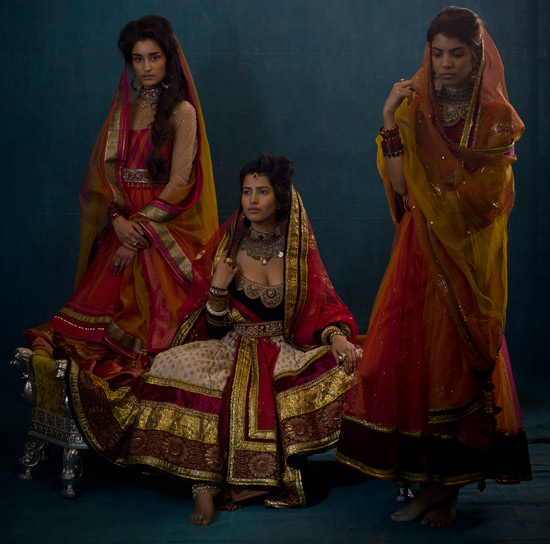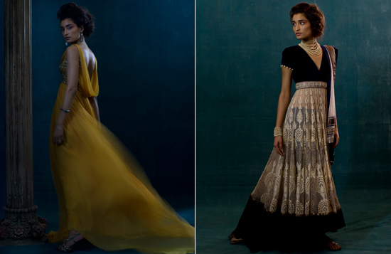 – Versatile, modern day anarkalis- in fresh citrus colors of mango and peach, with bodices plastered in a mesh of Swarovski Elements- with flowy, elegant drapes and deep scoop necklines, which can be paired with churidaars or worn as gowns.