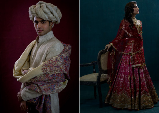 – For the groom an antique gold brocade sherwani with raised cream cotton thread work styled with along flared crinkled cotton kurta and an ivory stole which can be paired with a dhoti.